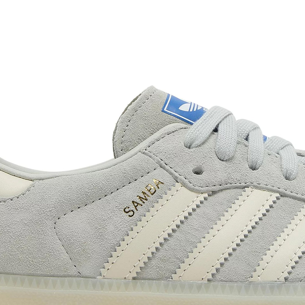 Crafted with a premium leather upper, the Adidas Samba OG 'Wonder Silver' features a striking "Wonder Silver" hue that dominates the shoe's exterior. This metallic finish is meticulously balanced with tonal suede overlays on the toe cap, adding texture and depth to the design. The classic T-toe design remains, providing a nod to the original Samba aesthetic. The contrasting gum rubber outsole not only ensures durability and grip but also accentuates the retro vibe of the sneaker. Complementing the exterior, the interior is lined with soft fabric, enhancing comfort for prolonged wear. Adidas' signature Trefoil branding is prominently displayed on the tongue and heel, tying together the shoe's heritage and modern appeal.