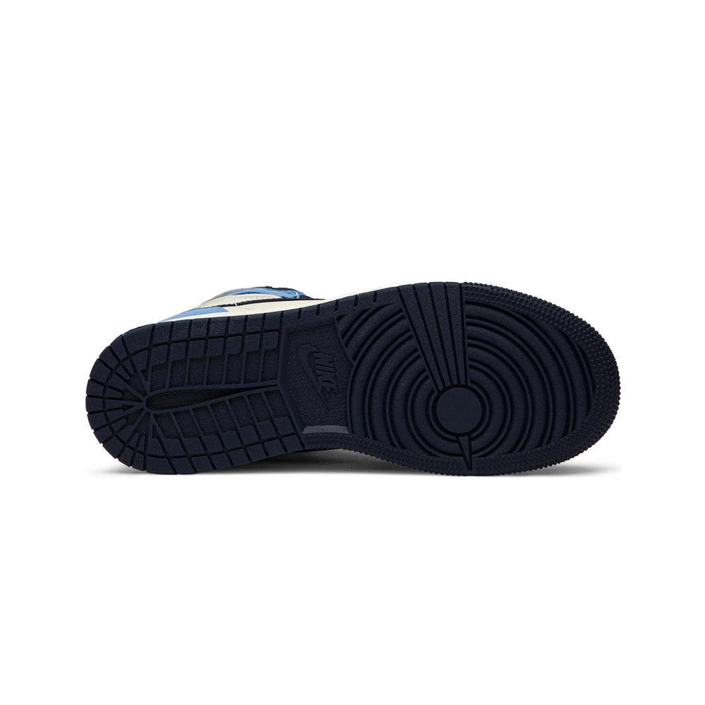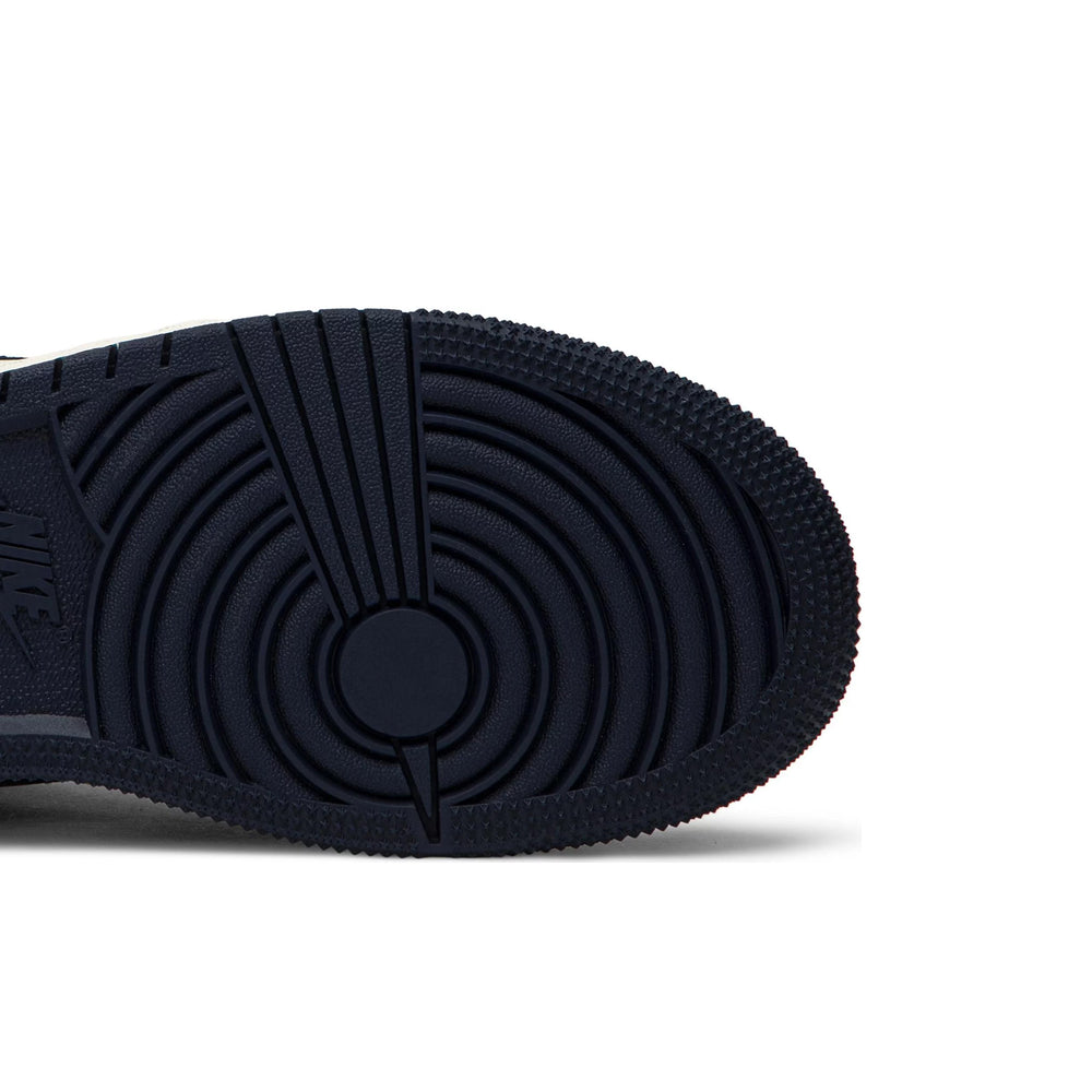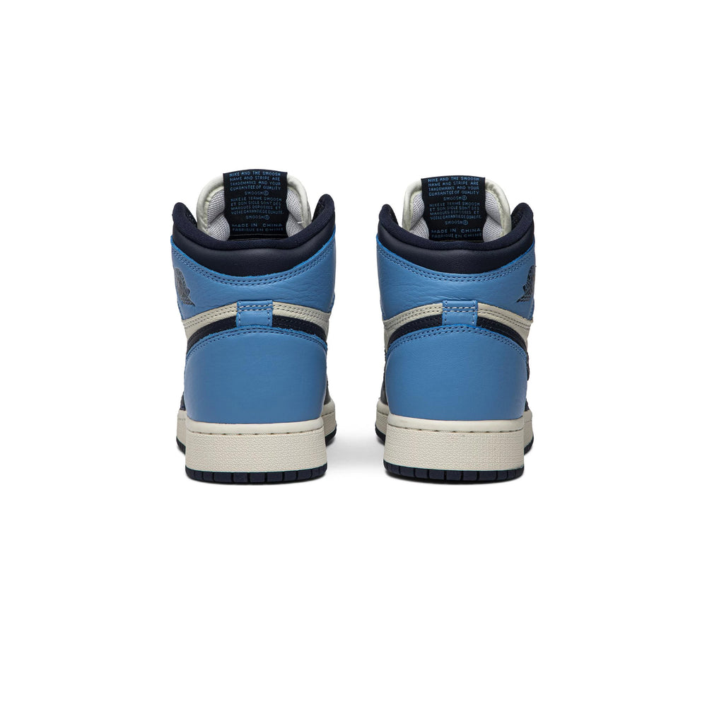 First released in 2019, the Air Jordan 1 Retro High 'Obsidian' GS features a combination of premium leather and meticulously balanced colors. The upper is primarily constructed from a "Sail" leather base, offering a subtle yet refined backdrop. Deep navy "Obsidian" overlays extend across the forefoot, eyestays, and heel, creating a bold contrast. Adding a pop of color, the "University Blue" accents on the collar and heel nod to Michael Jordan’s time at the University of North Carolina, enhancing the sneaker’s historic significance. The signature Swoosh in Obsidian, coupled with matching laces and outsole, completes the cohesive look. A perforated toe box ensures breathability, and the high-cut design provides ample ankle support, making this both a stylish and functional choice.