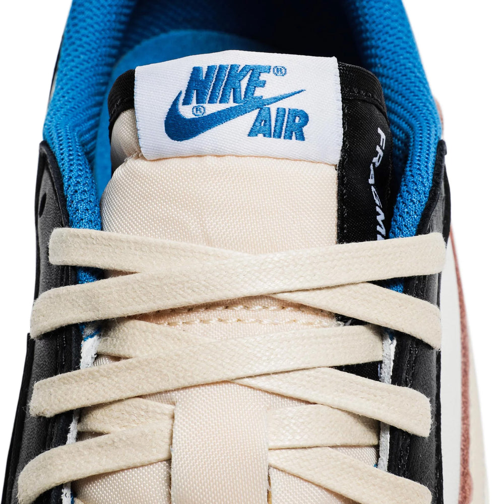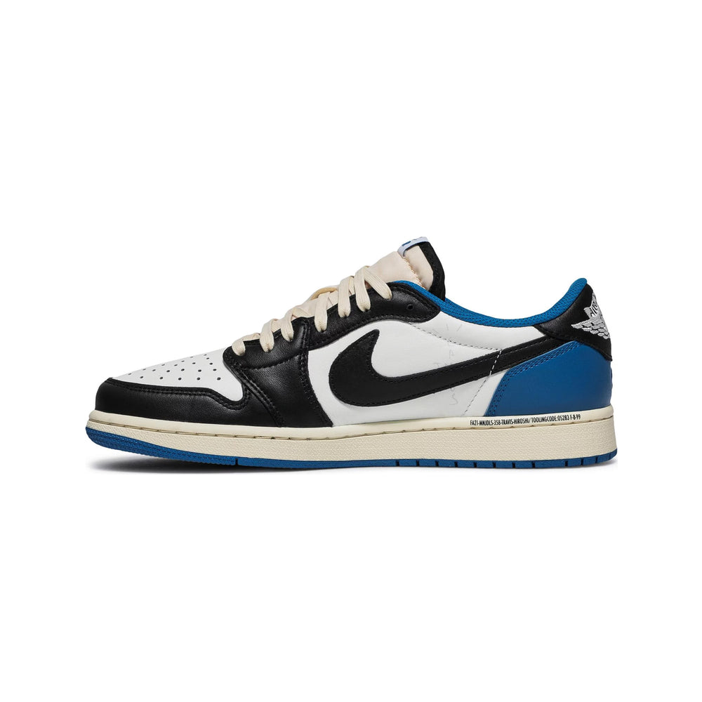 The Air Jordan 1 Retro Low OG 'SP Fragment x Travis Scott' (2021) features a striking "Sail" and "Military Blue" colorway, a nod to Fragment's signature palette. The reversed black Swoosh on the lateral side is a hallmark of Travis Scott's previous collaborations, creating an instantly recognizable aesthetic. Crafted with premium leather, the sneaker's quality construction ensures both comfort and durability. The co-branded logos of Travis Scott’s Cactus Jack and Fragment Design are embossed on the heels, adding an exclusive touch to this unique fusion of two influential forces in streetwear culture. The vintage midsole finish, combined with Scott’s signature oversized reverse Swoosh, elevates this pair beyond a simple homage to the Air Jordan 1 Low.