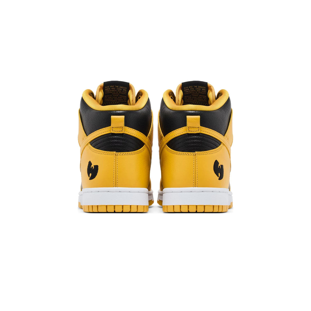 Inspired by the Wu-Tang Clan’s unmistakable branding, the Nike Dunk High 'Wu-Tang' features a striking black and yellow color scheme that mirrors the group's iconic logo. The shoe's premium leather upper combines a black base with vibrant yellow overlays, creating a sharp contrast that instantly stands out. The toe box, heel, and collar are all crafted from high-quality leather, ensuring durability while providing a luxurious feel. The signature Wu-Tang “W” logo is embossed on the heel and tongue tag, adding a subtle but meaningful touch of authenticity. The shoe’s crisp white midsole and classic rubber outsole complete the look, offering both comfort and style. This collaboration merges iconic street culture with Nike’s classic Dunk silhouette, making it a must-have for both sneakerheads and hip-hop fans alike.