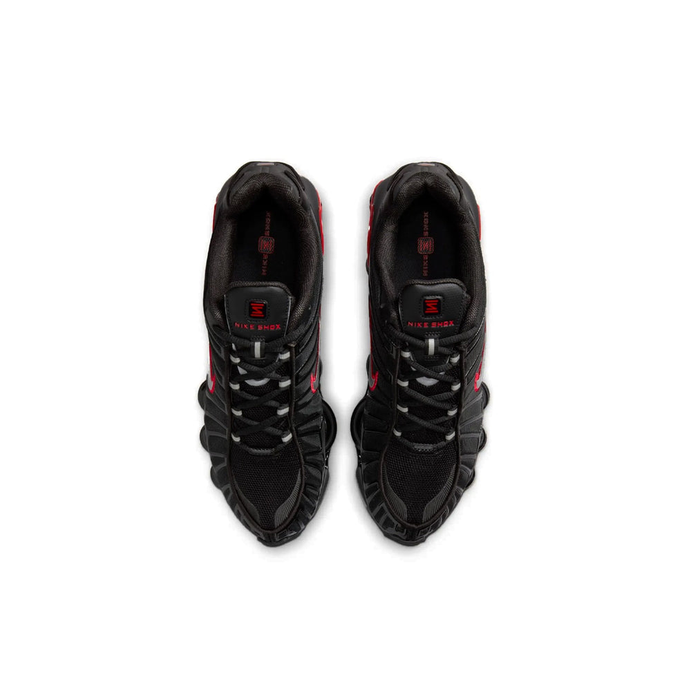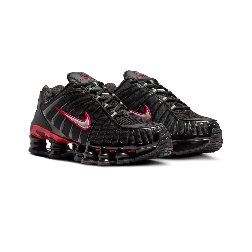 The Nike Shox TL 'Black University Red' features a breathable black mesh upper paired with glossy TPU overlays for a futuristic look that remains true to the early 2000s design. The signature Shox columns, which provide the shoe’s unique cushioning system, are highlighted in striking "University Red," adding a pop of color against the otherwise monochromatic black base. The upper's sleek, sculpted design is not only aesthetically pleasing but also enhances the sneaker's structural support. Completing the design is a durable rubber outsole, ensuring traction on various surfaces, making this shoe a blend of fashion and functionality.