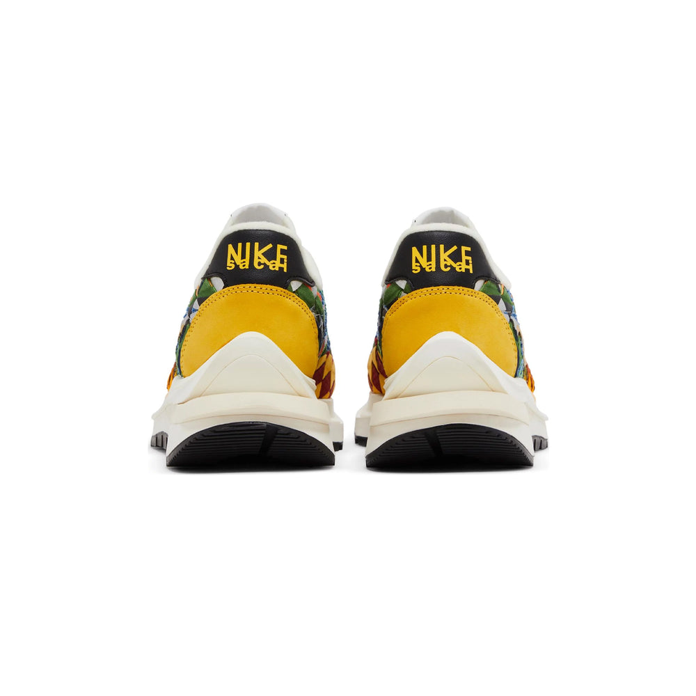 The Nike VaporWaffle 'Green Gusto' stands out with its layered design, which merges Sacai's signature double-stacked midsole with Gaultier's unique vision. The sneaker's upper is primarily crafted from woven materials that deliver both durability and a premium aesthetic. The vibrant "Green Gusto" colorway dominates the design, paired with contrasting black and white accents, creating a visually striking look. Sacai’s iconic double Swooshes further elevate the design, adding a dynamic touch to the upper. The sneaker also features a dual-layered tongue, a hallmark of the Sacai x Nike collaborations, and a thick, stacked midsole for both comfort and style. The rubber waffle outsole nods to Nike's heritage, offering superior grip and cushioning.
