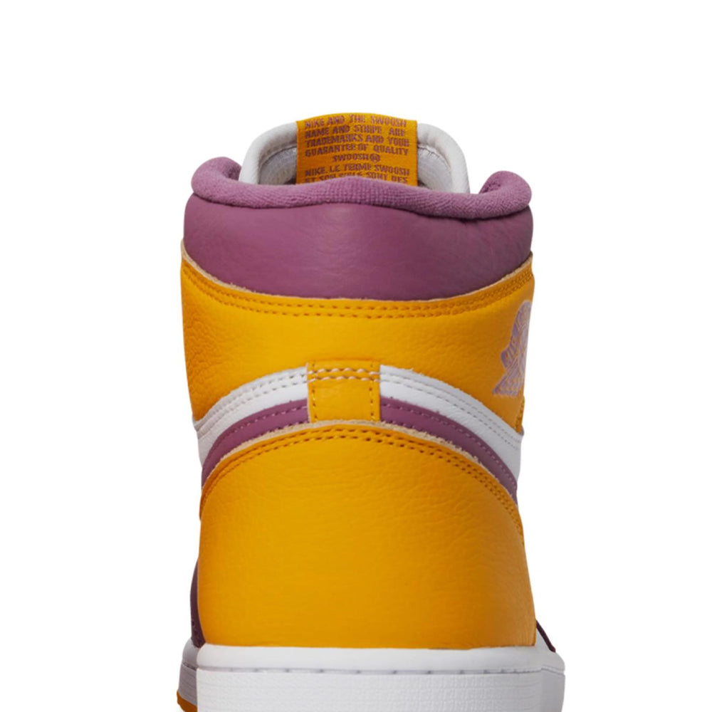 The Air Jordan 1 High Brotherhood debuts with a brilliant University Gold, purple, and white leather construction, taking design cues from the Omega Psi Phi emblem. Its colour scheme is straightforward and striking, evoking previous Jordan 1 releases like the Bred Toes and Shattered Backboards. The design is finished in vintage style with a woven Wings logo at the collar and a Nike tongue label.