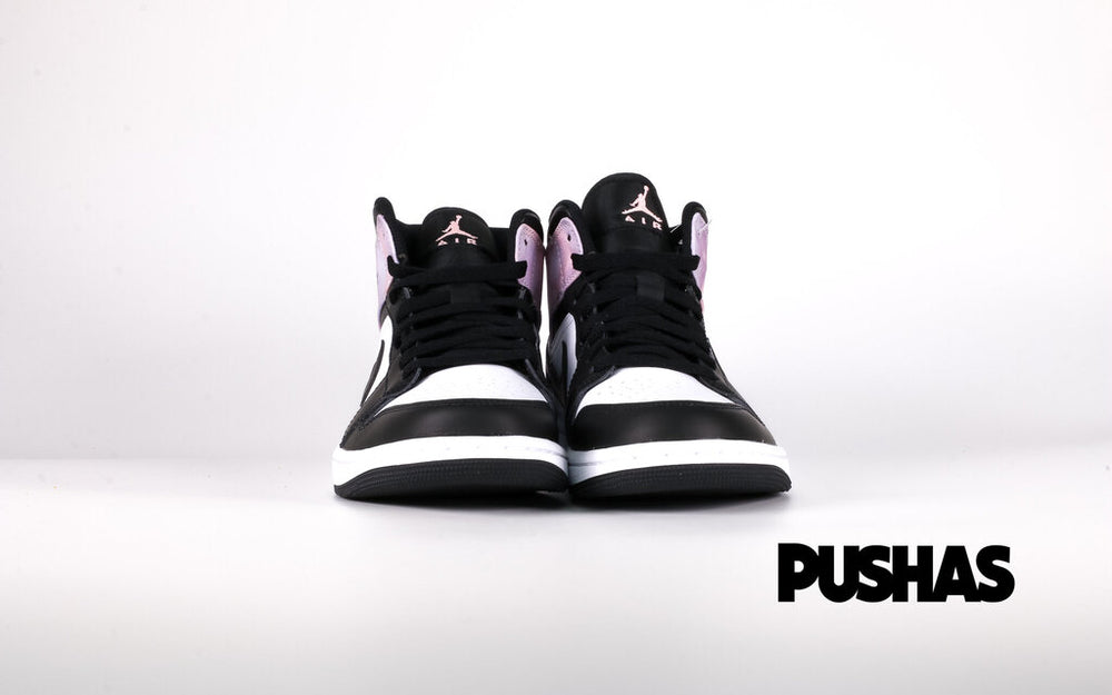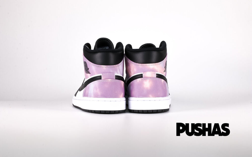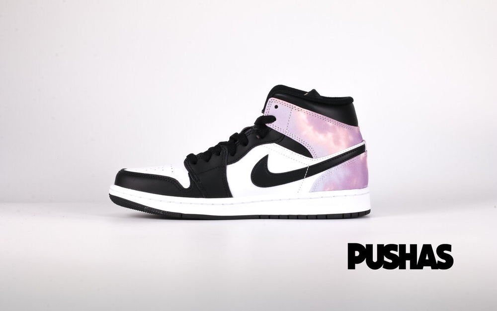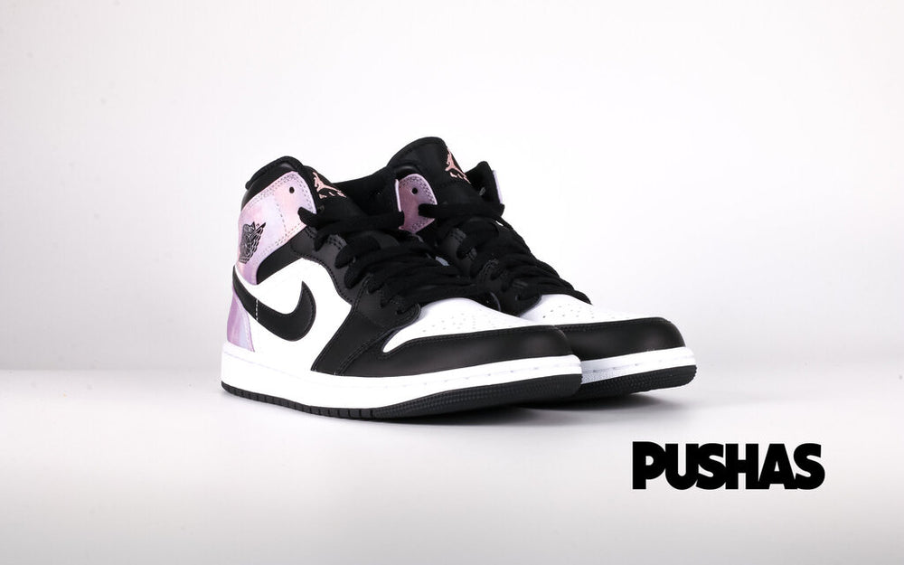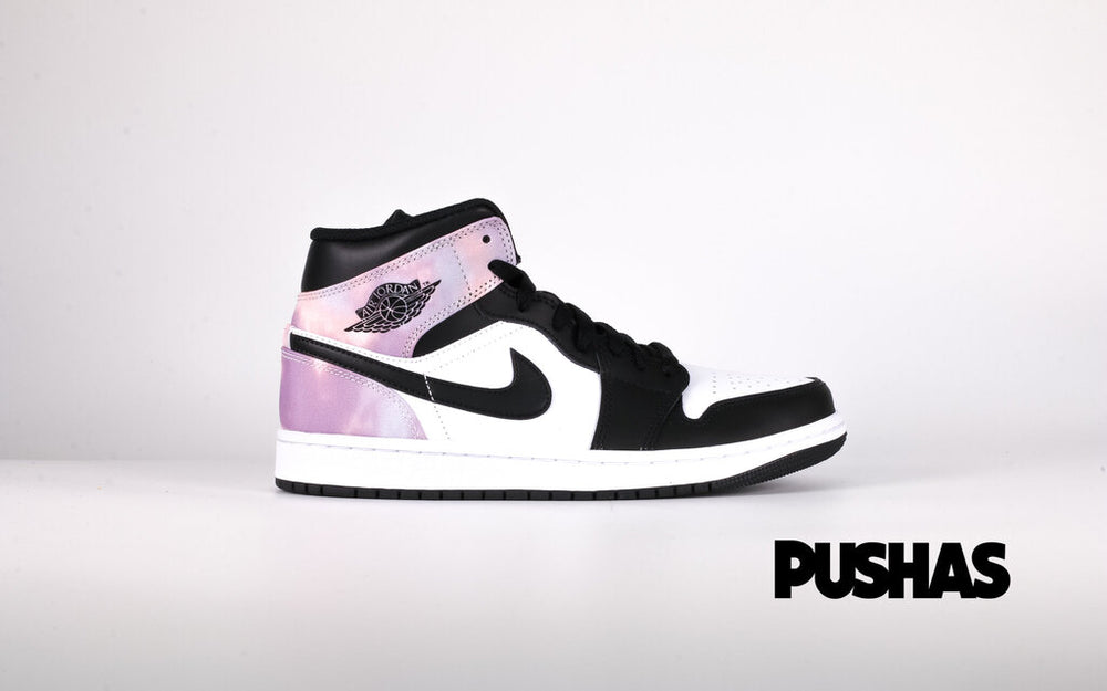 Buy the Nike Air Jordan 1 Mid 'Zen Master' (2022) The overlays are suited up in black, its leathers smooth all through the profile. A white base lays underneath in the same material, matching the midsole but not its tread nor the dark shade of the laces and tongue. Especially disparate are the heel and Jumpman branding: the latter in its solid pink finish and the former in its pastel-dominant tie-dye.