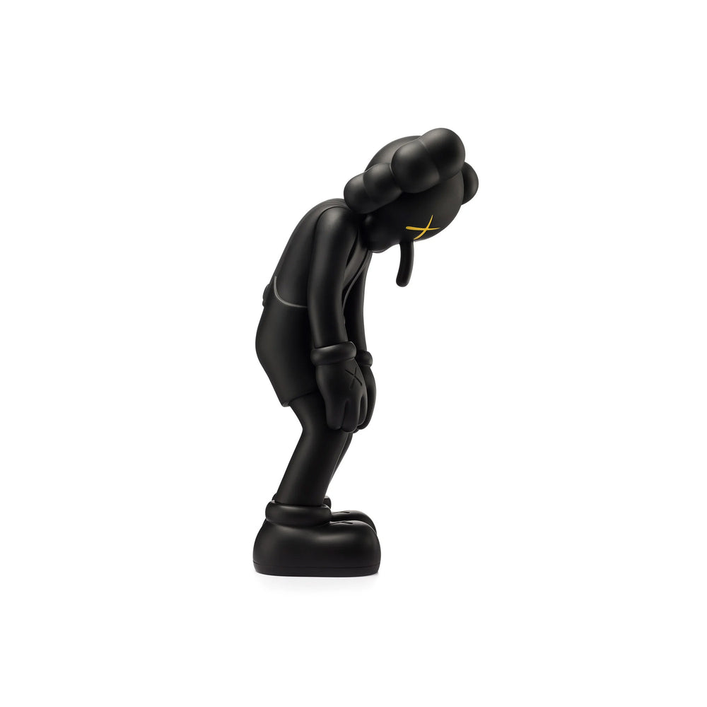 In December 2017, KAWS unveiled "Small Lie," a new iteration of his iconic sidekick. The sculpture depicts the companion stooped over in what looks to be a dejected posture and sporting a long, Pinocchio-like nose. This figurine was distinct from the Open Edition Companions in that the character wore overalls, and it did not come in flayed variations. A black-and-all-black pattern with yellow accents is utilized to cover this Small Lie Companion in Black. Originally unveiled as a 30-foot-tall African hardwood monument at the Yorkshire Sculpture Park in the United Kingdom, the little lie companion is now offered at a size that will realistically fit in your apartment.