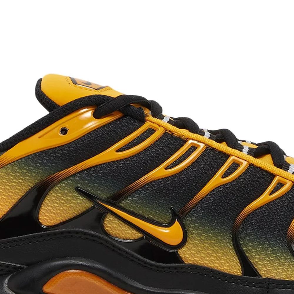 Crafted with a black mesh upper, the Nike Air Max Plus TN 'Black Sundial' features a dynamic gradient pattern that transitions from deep black to a vibrant sundial hue. This visually arresting design is accentuated by the signature wavy TPU overlays that provide structural support and enhance the sneaker's aesthetic appeal. The midfoot arch shank is adorned with a contrasting yellow-to-orange gradient, reminiscent of a setting sun, while the iconic Tuned Air technology ensures superior cushioning and impact protection. The Swooshes, both on the lateral and medial sides, are subtly integrated, maintaining the shoe’s sleek profile. Reflective accents on the tongue and heel add a touch of modernity, ensuring visibility in low-light conditions.