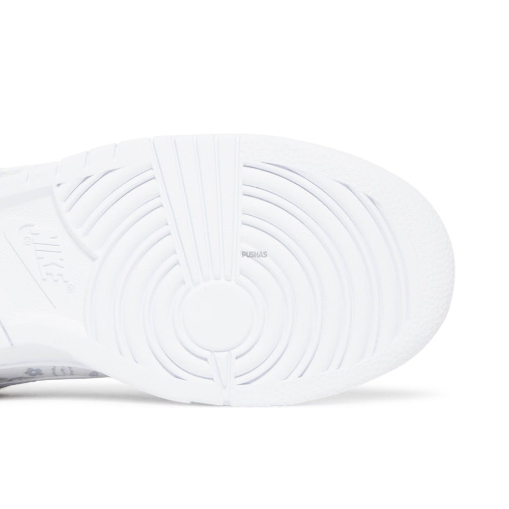 Crafted with meticulous attention to detail, the Nike Dunk Low 'White Paisley' showcases a pristine "White" leather upper, exuding sophistication and versatility. The standout feature is the intricately designed "White Paisley" print, gracefully adorning the Swooshes and heel tab, adding a touch of refined artistry. This subtle yet striking pattern elevates the sneaker's aesthetic, making it a versatile piece for both casual and stylish ensembles. The clean white midsole and matching rubber outsole ensure a cohesive look, while the perforated toe box enhances breathability, providing comfort and functionality.