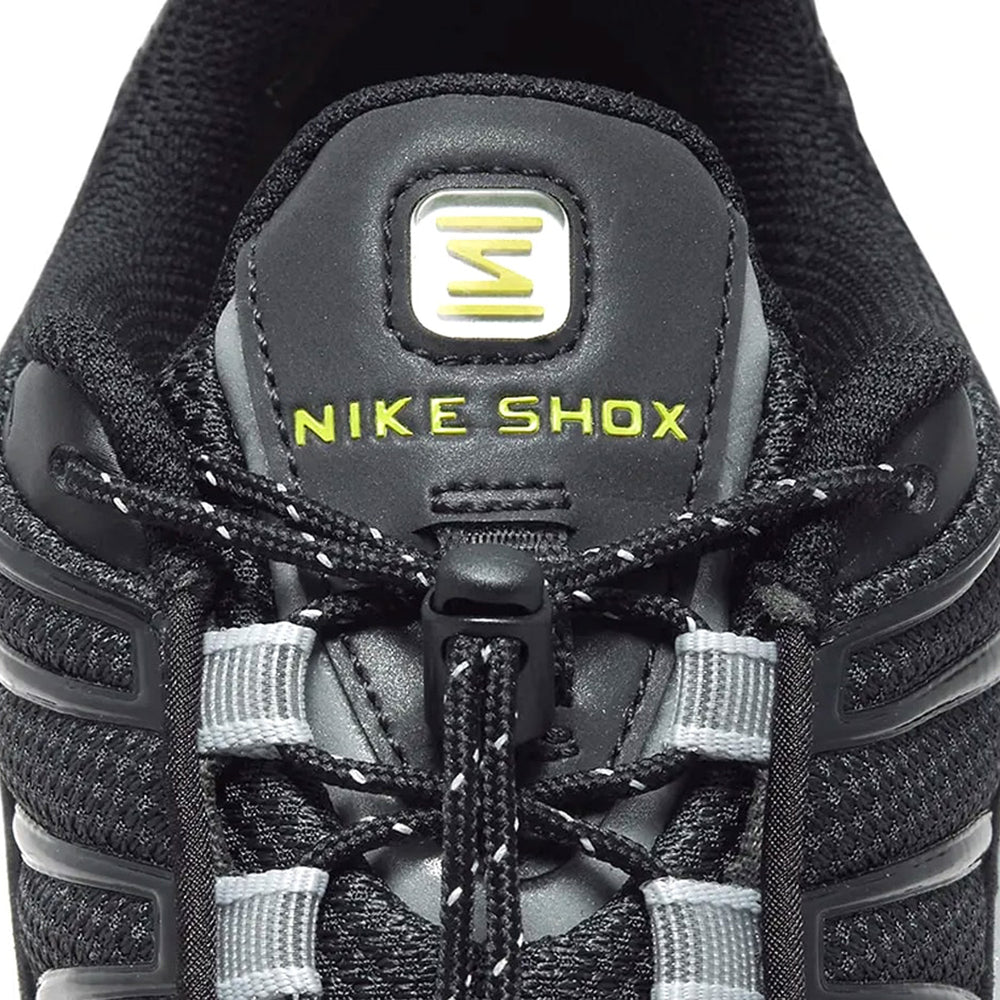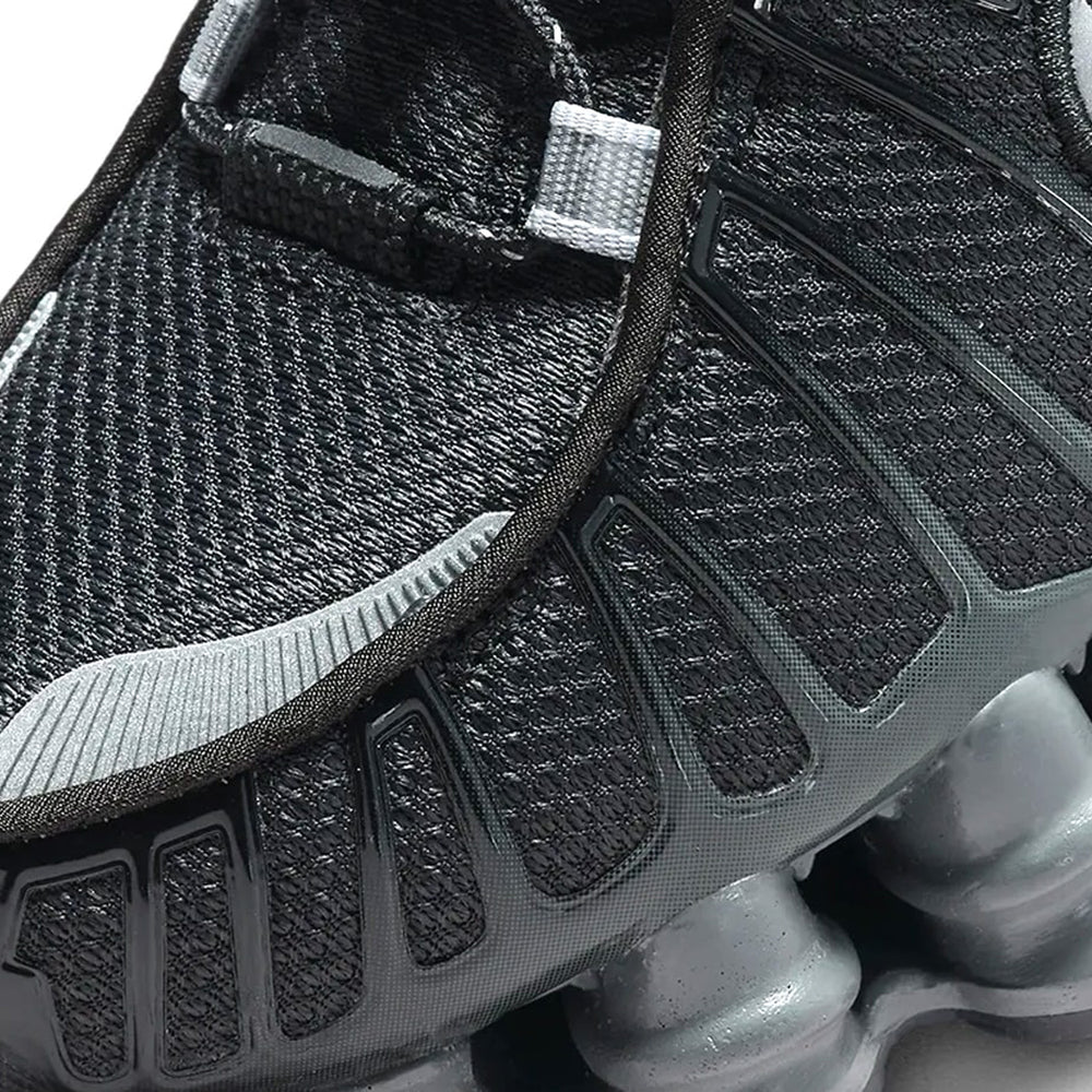 The Nike Shox TL 'Black Iron Grey' Women's model features an all-black mesh upper accented by iron grey details, creating a sleek and versatile look. The Shox technology—pioneered by Nike in the early 2000s—remains the defining characteristic, providing unmatched impact absorption and responsive cushioning through its columnar design. This iteration combines breathable materials with the robustness of synthetic overlays, ensuring both comfort and durability. A black midsole integrates seamlessly with the iconic Shox pillars, while subtle branding adds a touch of understated elegance. The rubber outsole offers reliable traction for varied surfaces, making these sneakers ideal for daily wear.