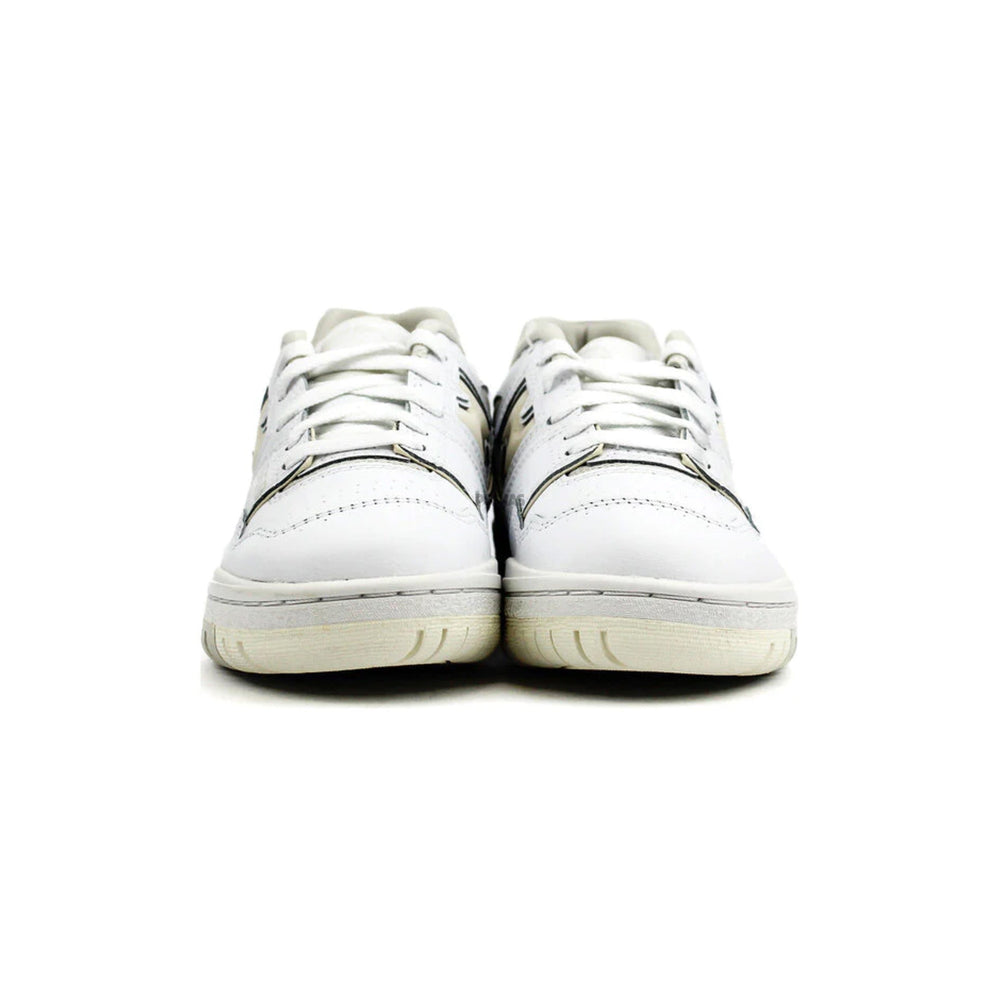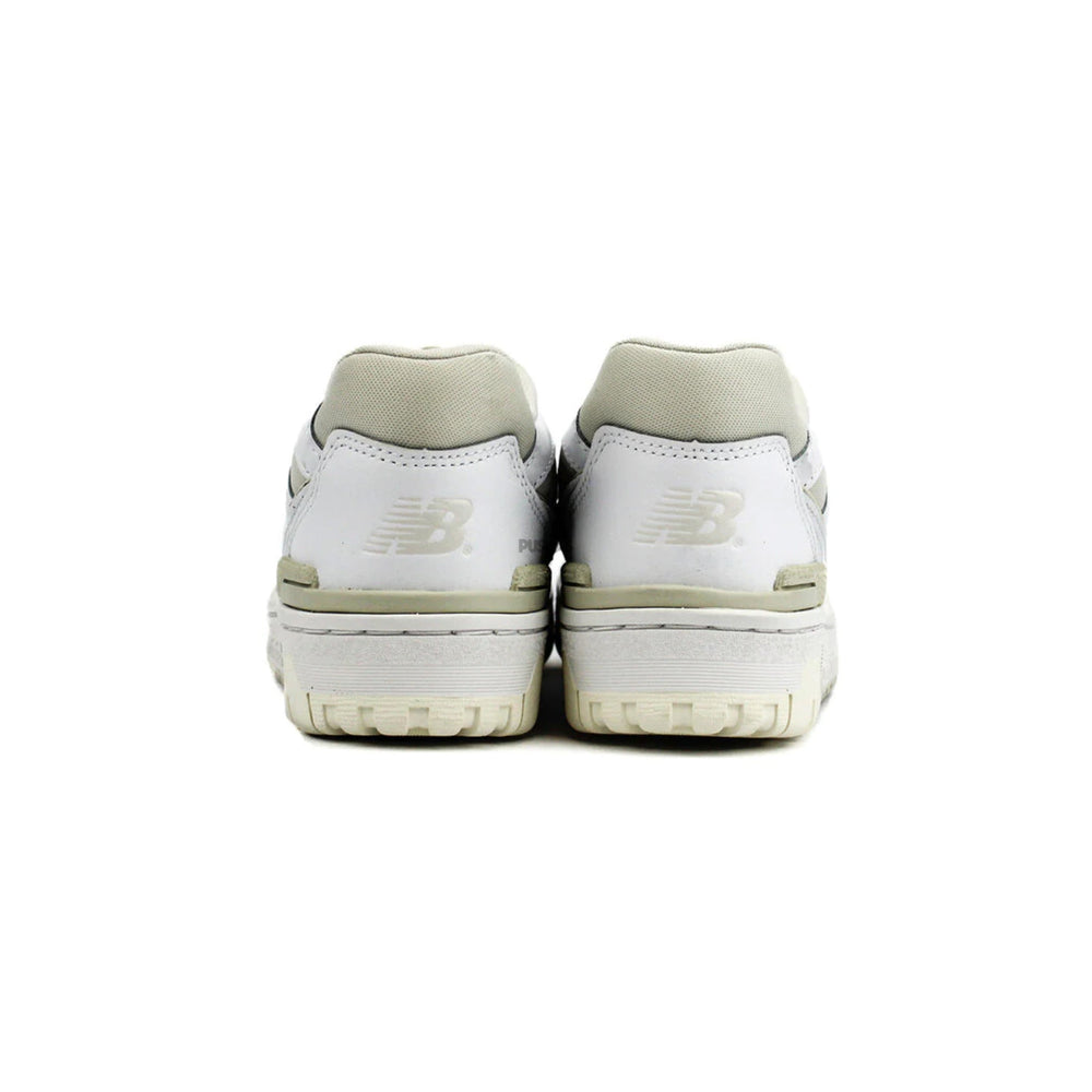 The "N" logo is covered in cream detailing, and the mesh heel tab is located above the embossed vintage logo. The women's 550 New Balance Silver Birch sneakers have a cream rubber outsole, a thick white midsole, and a cream heel clip. The New Balance Logo may be seen on the insole, the outsole, the sides, and the rear of the shoe.