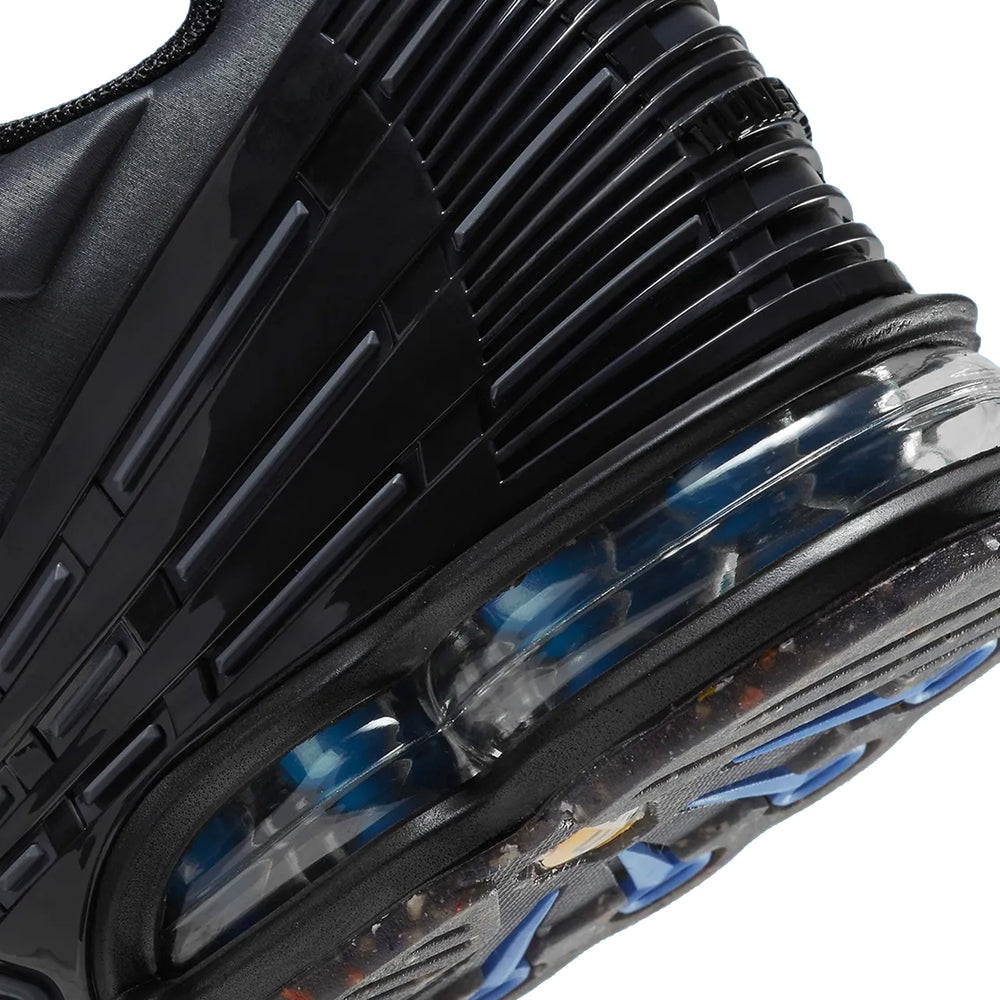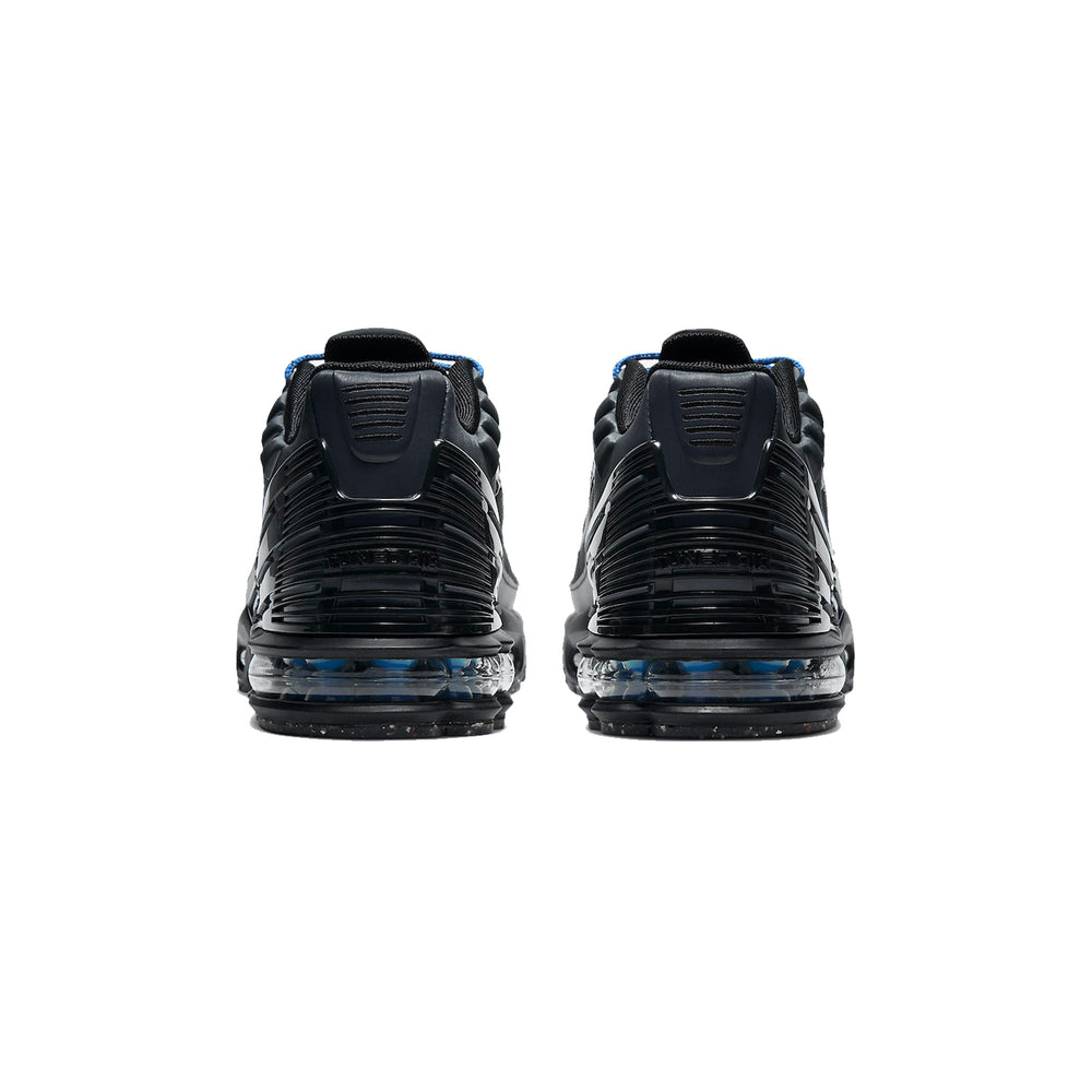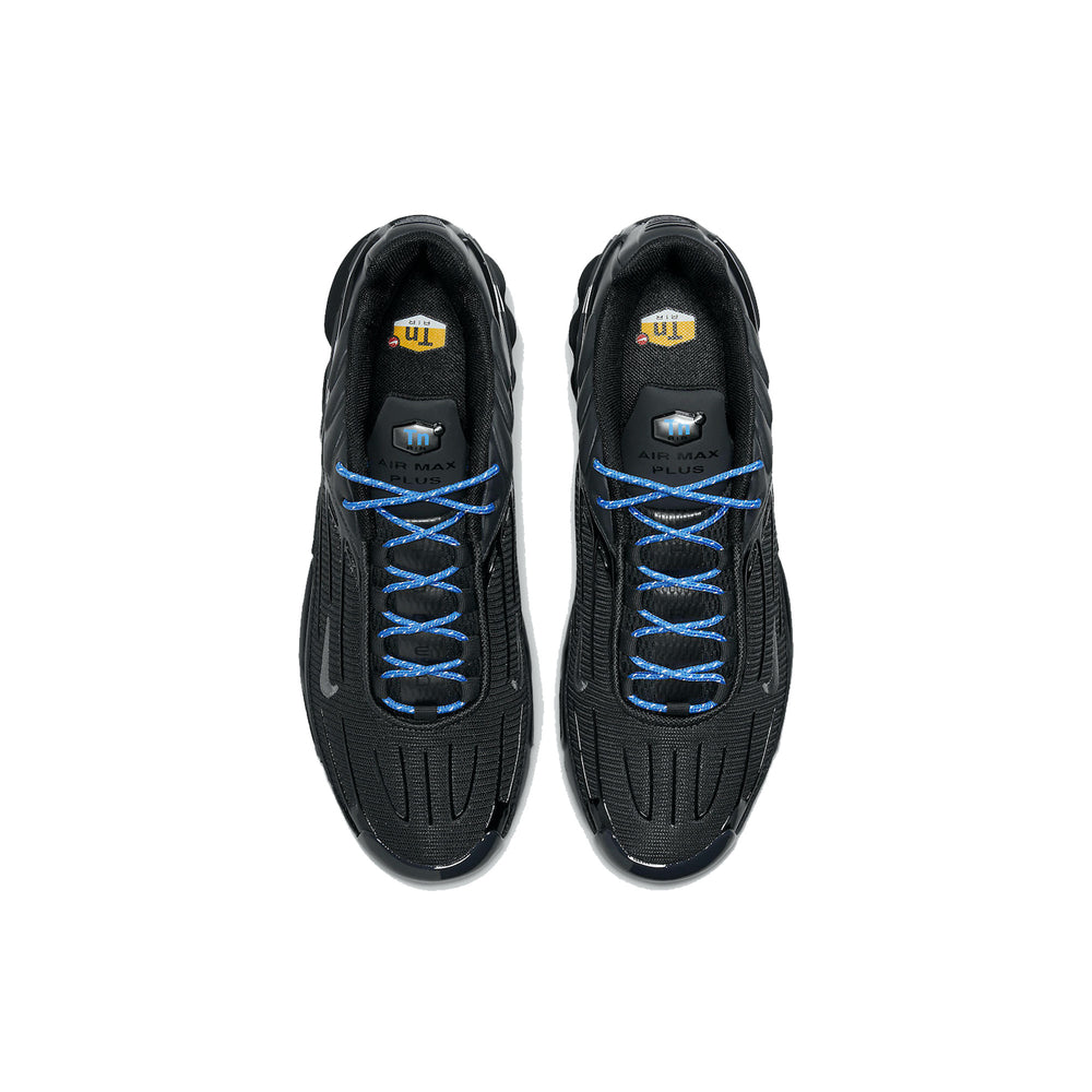 The Black base of this version of the Nike Air Max Plus 3 is made of a combination of leather and mesh, and the TPU heel clip adds strength, stability, and style. The design is finished off with blue rope-speckled laces, "Tuned Air" branding, Air units in the heel and forefoot, and a rubber outsole.
