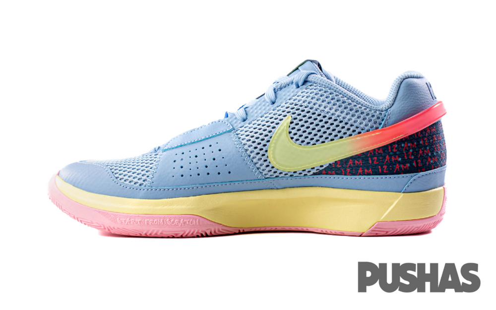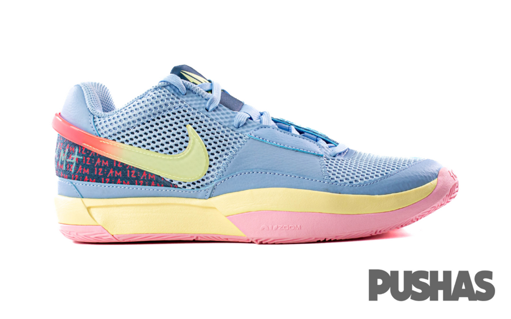 The Cobalt Bliss leather and mesh uppers of the Nike Ja 1 Day One are placed on top of Citron midsoles. The insole of the left sneaker and the tongue of each sneaker include the freshly created Ja Morant logo. A handwritten note from Ja that is dedicated to his staunchest followers and those who have supported him throughout his journey is printed on the insoles.