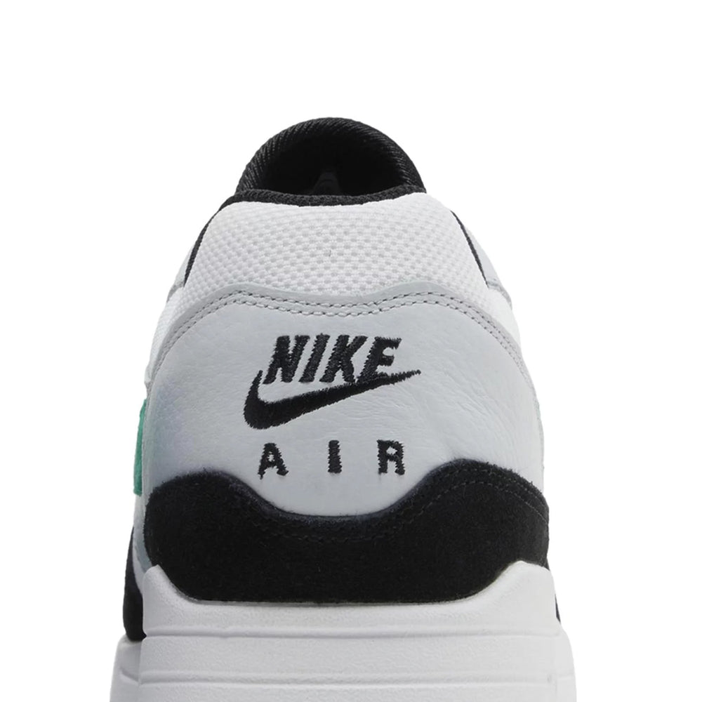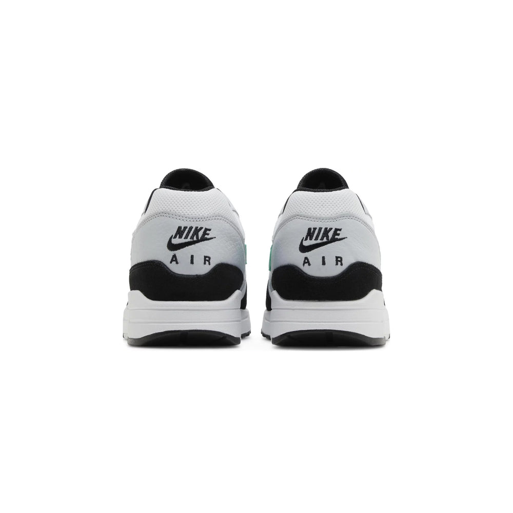 The Nike Air Max 1 'White Black Stadium Green' boasts a clean white mesh upper paired with black leather overlays, creating a sophisticated yet casual aesthetic. The addition of "Stadium Green" accents elevates the design, notably in the Swoosh and the heel tab, injecting a burst of color that balances the monochrome base. The sneaker sits on the iconic Air Max unit, providing both comfort and style. A white midsole and a black rubber outsole round out the design, ensuring durability and traction. This release continues Nike’s tradition of blending high-performance materials with eye-catching color schemes, making it a must-have for sneaker enthusiasts.
