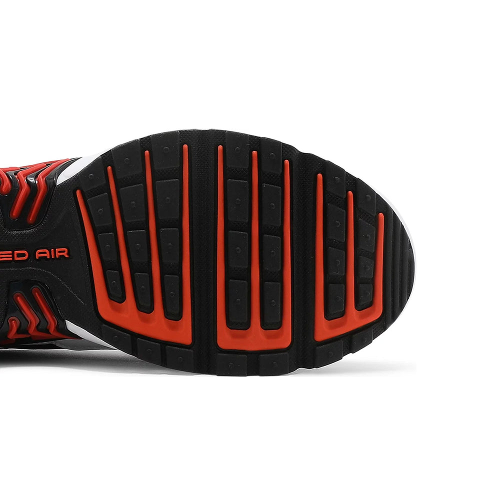 Crafted with a pristine white mesh base, the sneaker is intricately detailed with dynamic black synthetic overlays that emphasize the shoe's futuristic design language. The eye-catching Team Orange accents provide a bold contrast, running along the midsole shank, Air units, and the signature Tuned Air logos on the heel. The gradient effect on the midsole and heel counter enhances the shoe's visual appeal, creating a sense of motion even when stationary. Nike's innovative Air cushioning technology is embedded within, delivering unmatched comfort and responsiveness.