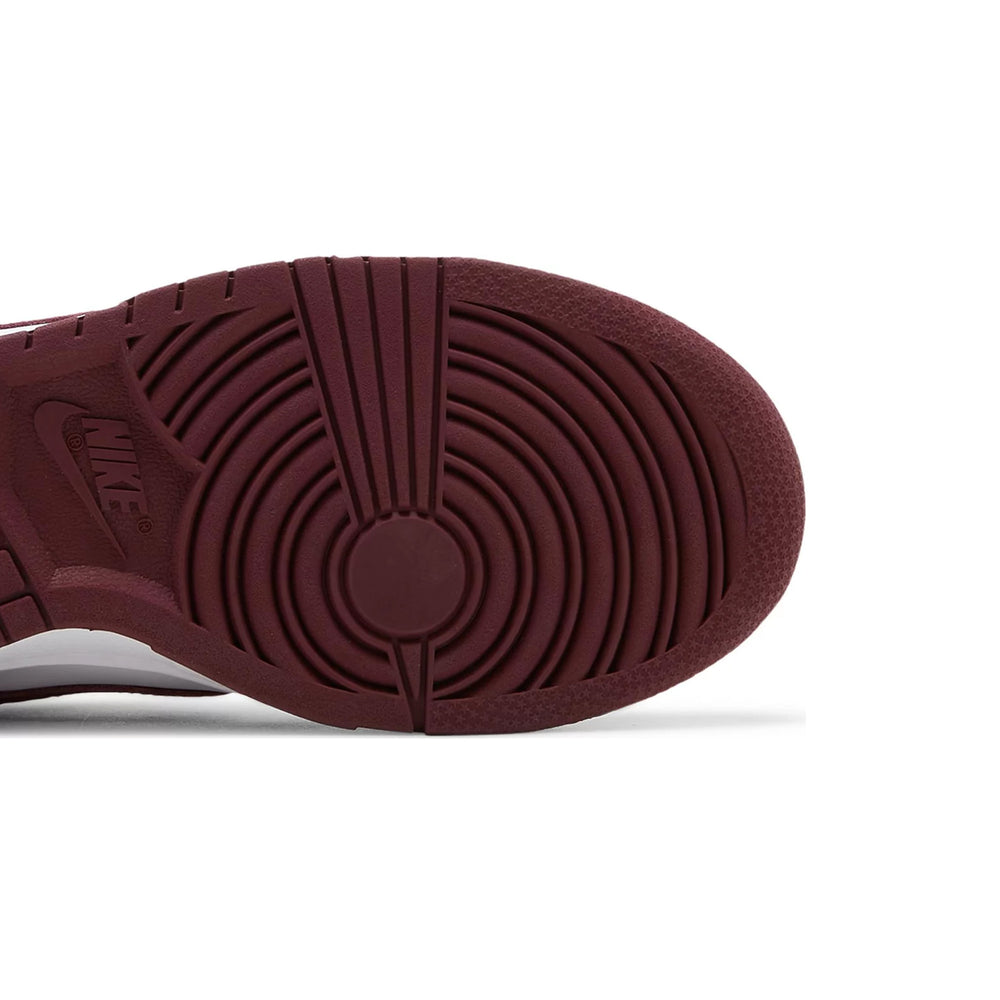 The Nike Dunk Low 'Bordeaux' Women's (2021) is adorned with a luxurious "Bordeaux" leather upper that exudes sophistication and subtlety. The deep maroon hue is perfectly complemented by contrasting white leather overlays, creating a striking visual balance. This classic colorway pays homage to Nike's heritage while offering a modern appeal that resonates with today’s fashion-forward consumers. The sneaker features a traditional perforated toe box, maintaining breathability, while the padded collar and tongue ensure comfort for all-day wear. The white midsole and Bordeaux rubber outsole provide a clean finish, enhancing the sneaker's overall aesthetic and durability. The iconic Nike Swoosh in Bordeaux leather seamlessly integrates into the design, adding a touch of minimalistic flair.