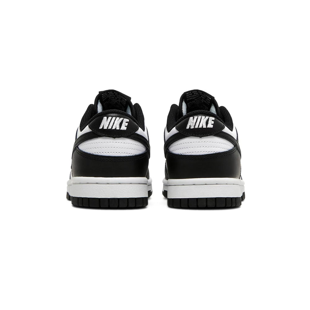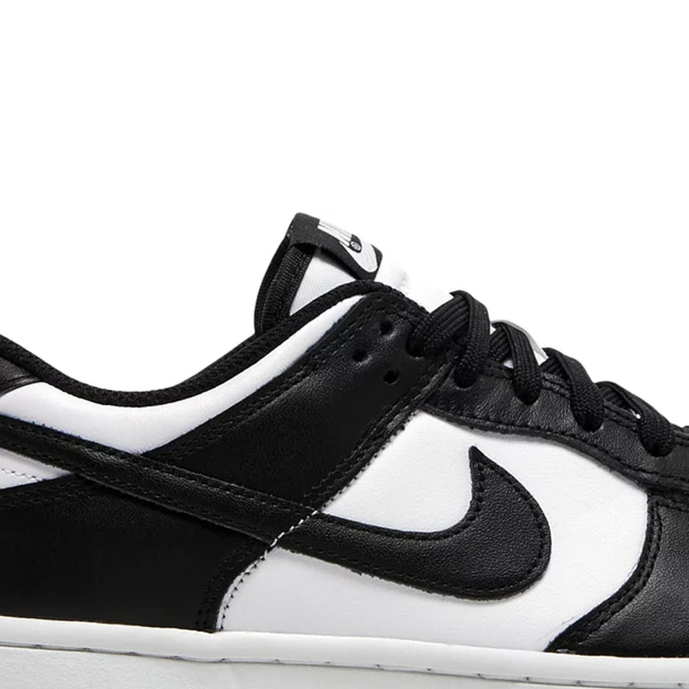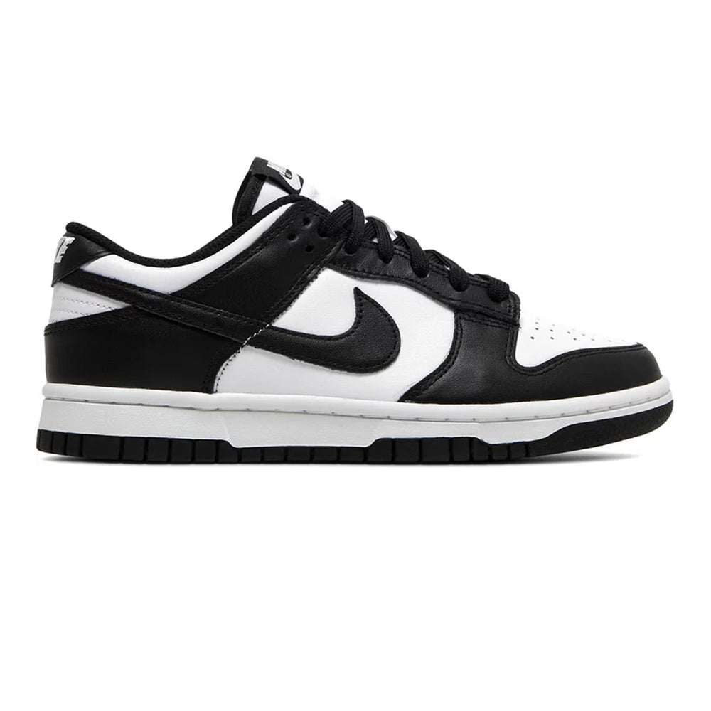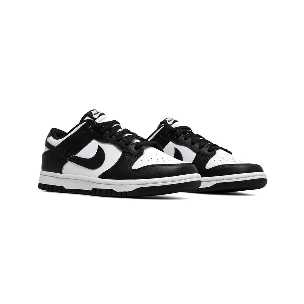 The Nike Dunk Low 'Panda' for women is draped in a timeless black and white colorway, showcasing a clean and refined aesthetic. The upper features a pristine white leather base, complemented by contrasting black leather overlays that accentuate the shoe’s sleek profile. The Swoosh logo, also in black, blends seamlessly with the overlay design, while a matching black outsole grounds the sneaker in a cohesive and versatile finish. This model is further distinguished by its understated elegance, making it suitable for a wide range of outfits and occasions. The design maintains the classic Dunk Low silhouette, celebrated for its comfort and style, while incorporating contemporary touches that cater to modern tastes.