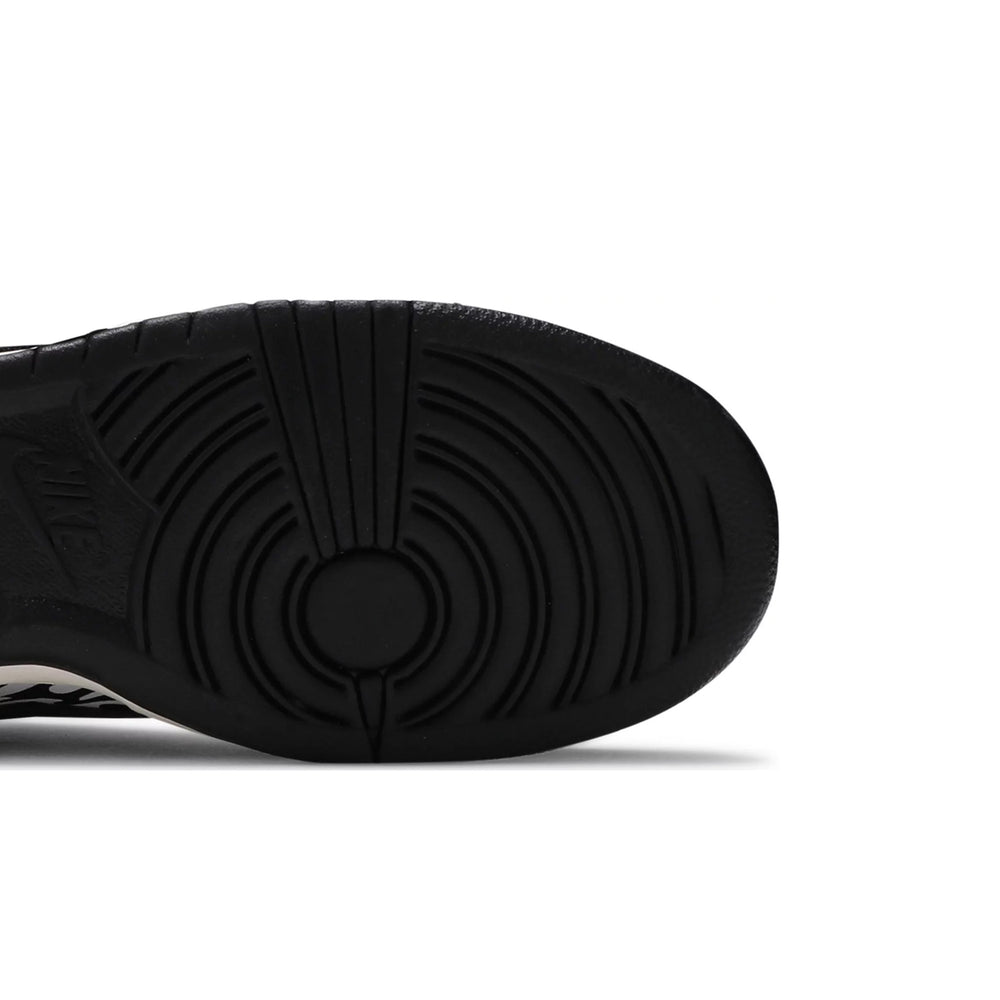 The 'Quartersnacks Zebra' Dunk Low features a striking black-and-white zebra stripe pattern across the premium leather upper, ensuring a bold, eye-catching look. Complementing the wild design, black suede overlays provide durability and contrast, enhancing the sneaker's overall structure. The Quartersnacks branding appears on the lateral heel, a nod to the skate publication's influence and heritage. A crisp white midsole and black rubber outsole offer excellent board feel and grip, essential for skateboarding performance. The mesh tongue and padded collar ensure a comfortable fit, while the classic Nike SB Dunk design elements, such as the perforated toe box and iconic Swoosh, complete this standout sneaker.