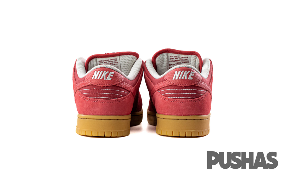 The Nike SB Dunk Low 'Adobe' (2022) low-top is both bold and fashionable. It has a red-draped canvas upper, and coral pink suede overlays and leather Swooshes lend more vibrancy to the base. The profile is nicely solidified by the use of contrast white for the inner lining and tongue tags, graphic insoles, and a gum rubber outsole.