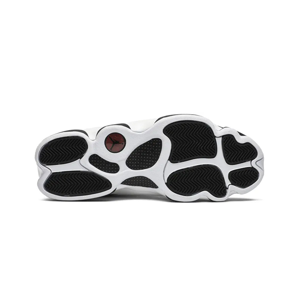 The top of this Jordan 13 is made of black tumbled leather with white overlays and red accents. The design is completed by a distinctive hologram on the ankle, a black midsole, and a white outsole.