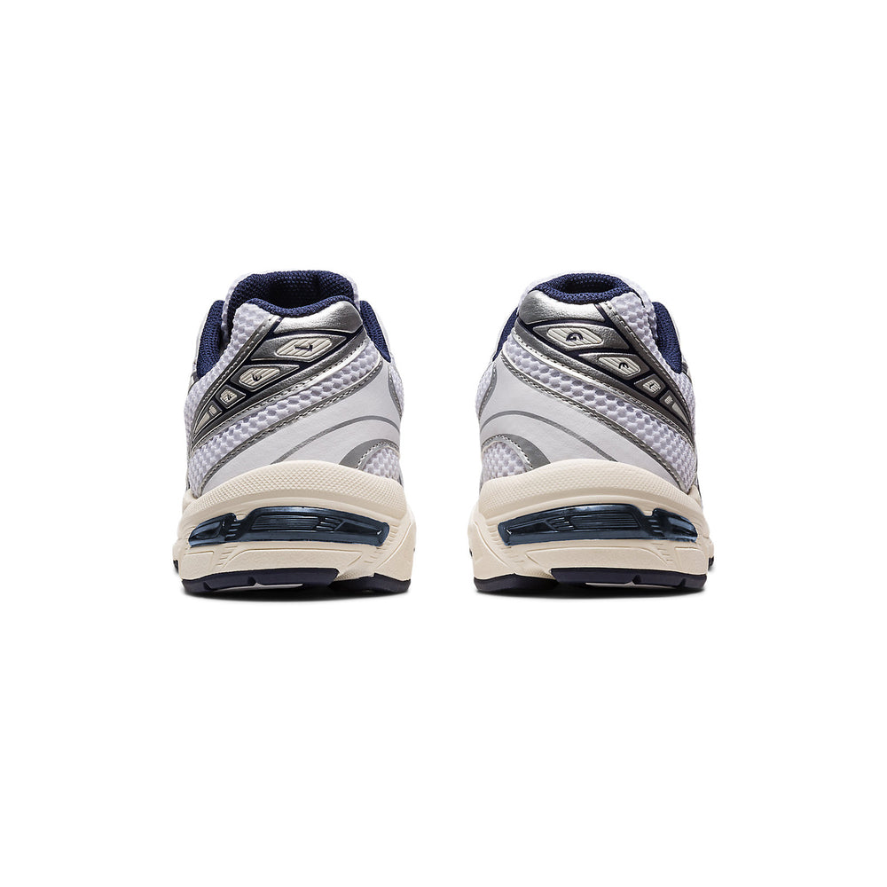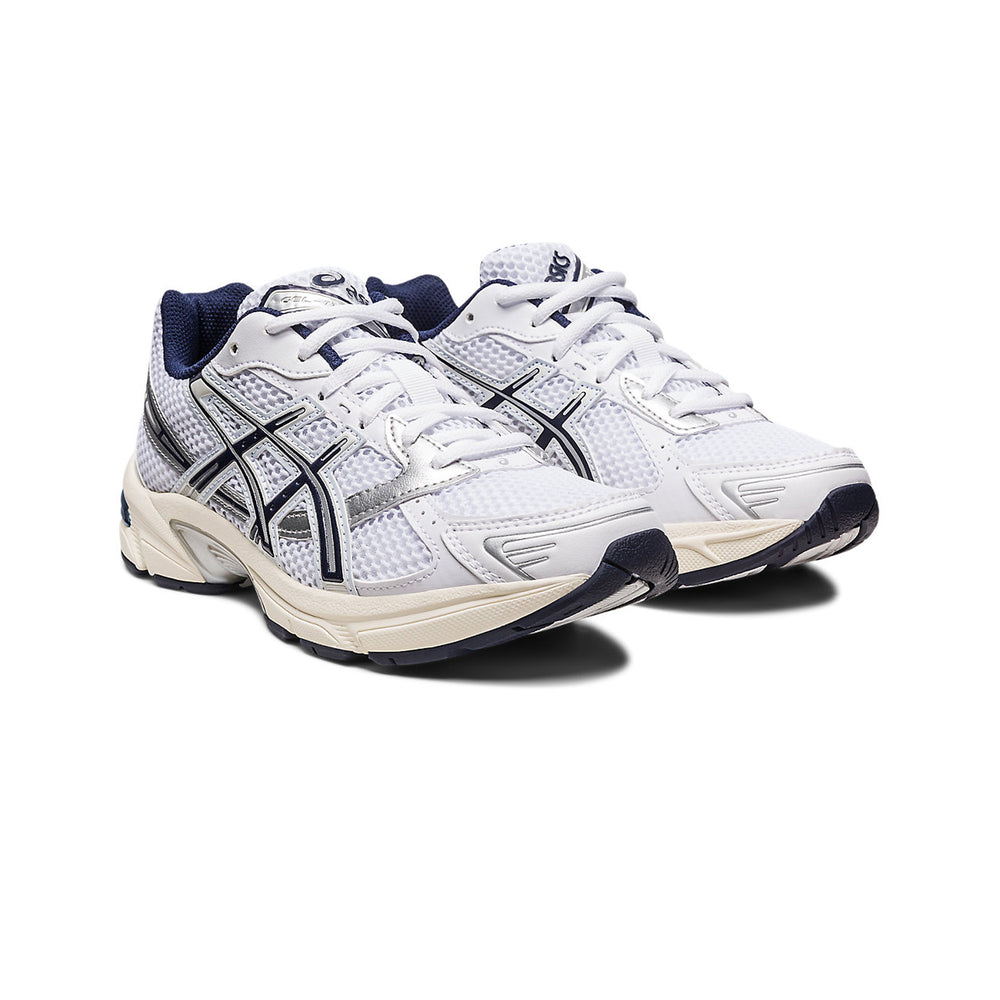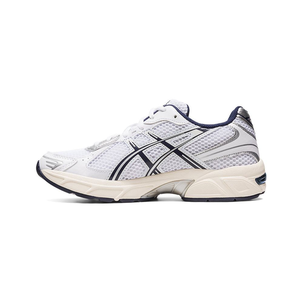 The ASICS Gel-1130 'White Midnight' features a crisp white mesh base, providing breathability and a lightweight feel, ideal for both casual and athletic wear. Complementing this is the strategic placement of synthetic leather overlays in a contrasting midnight blue, offering enhanced support and durability. The design is anchored by ASICS' signature GEL cushioning technology in the midsole, ensuring exceptional comfort and shock absorption with every step. The intricate detailing includes reflective accents, adding a touch of sophistication while improving visibility in low-light conditions. The outsole is designed with a durable rubber compound that provides reliable traction on various surfaces, making it as functional as it is stylish.