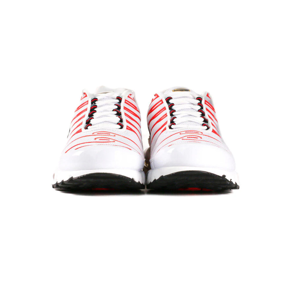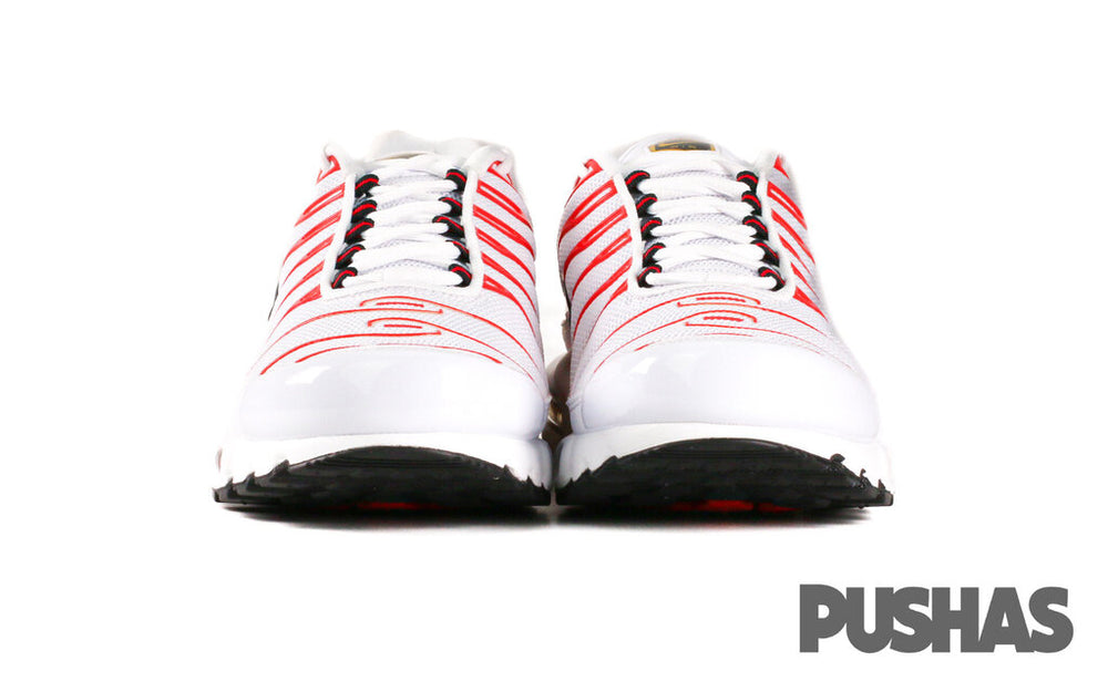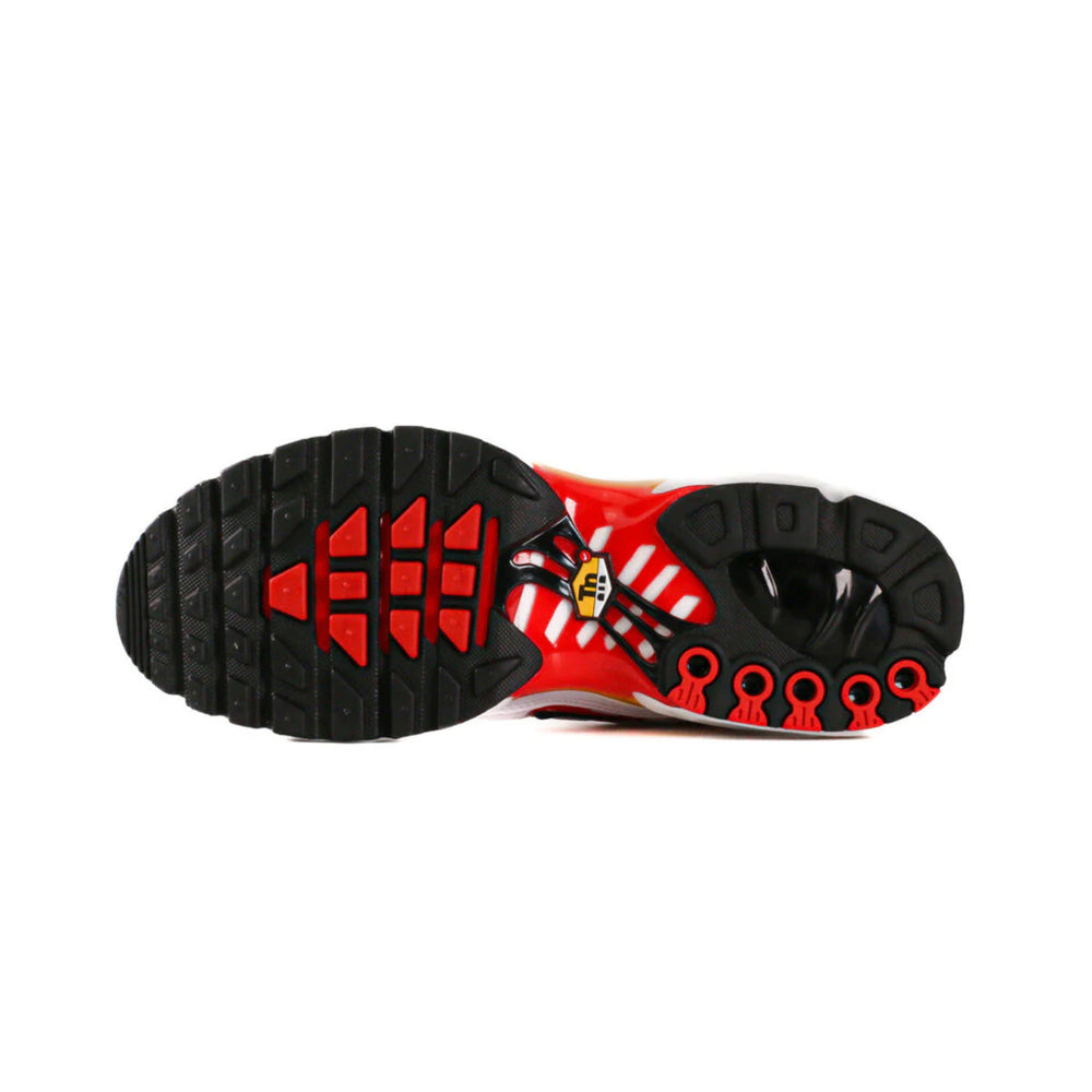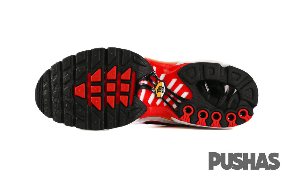 The Air Max Plus was designed by Nike designer Sean McDowell with Florida beaches in mind, and the appropriately titled "Sunburn" colourway has a white mesh upper with TPU overlays that have a gradient fade from yellow to red. Additional yellow is included on the midsole shank, and for increased visibility, bright bars are coupled with performance features like the outsole flex grooves along the forefoot, vamp, and tongue.
