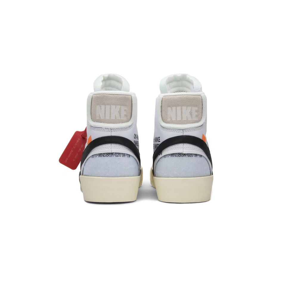 The Nike Blazer Mid 'Off-White' (2017) features a deconstructed aesthetic, with exposed foam, stitched-on Swooshes, and industrial-style text on the medial side, reflecting Abloh's signature design language. The shoe's upper is composed of a mix of leather, suede, and mesh, providing both durability and texture contrast. A standout detail is the oversized, exaggerated Swoosh that extends to the midsole, further emphasizing the deconstructed theme. The shoe is finished with Abloh's signature zip tie in red, adding a distinctive touch to this already iconic design. Each element of the Blazer Mid 'Off-White' is meticulously crafted, ensuring that the sneaker not only serves as a fashion statement but also as a symbol of innovation in design.