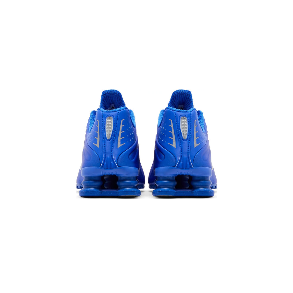 The Nike Shox R4 'Racer Blue Metallic Silver' features a bold Racer Blue upper constructed from a combination of premium leather and synthetic materials. This striking blue base is accentuated by metallic silver overlays that enhance the shoe's dynamic profile. The standout feature is the integrated Shox cushioning system, which provides superior comfort and responsiveness with its signature column-based technology. The sleek, metallic silver accents are further reflected in the eyelets and heel counter, offering a futuristic edge to the overall design. The shoe's breathable mesh tongue and padded collar ensure a snug, supportive fit, while the black outsole with a white Shox column completes the look with a versatile touch.