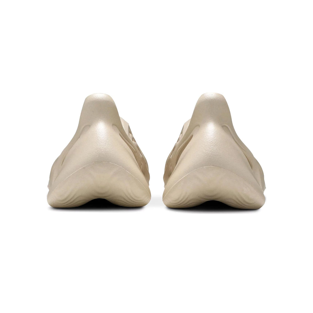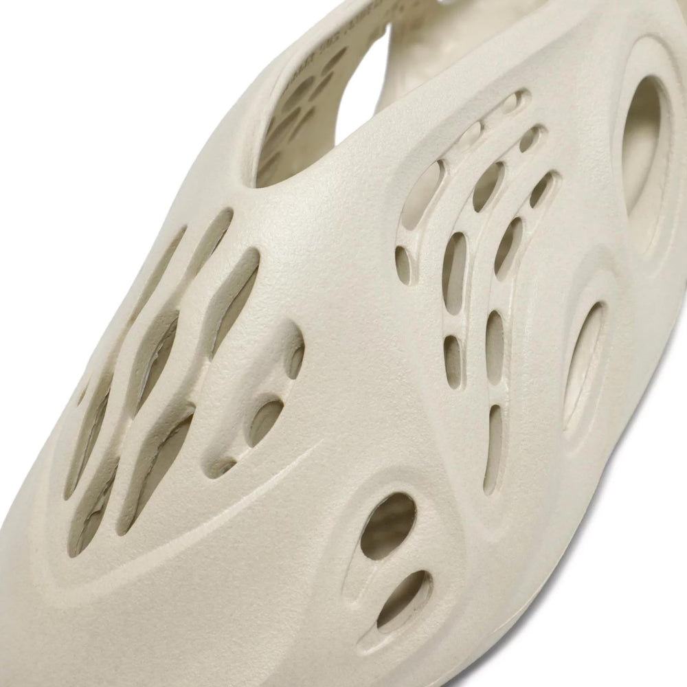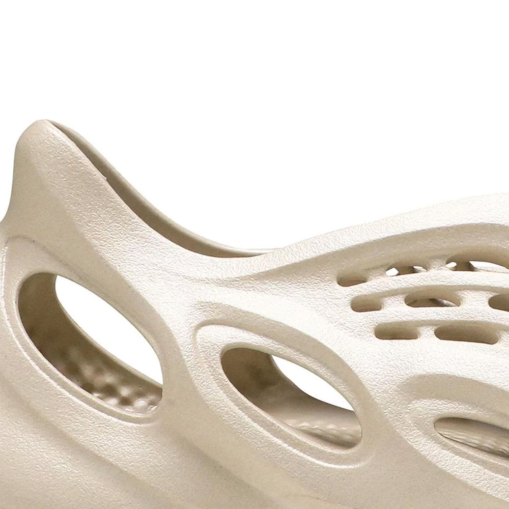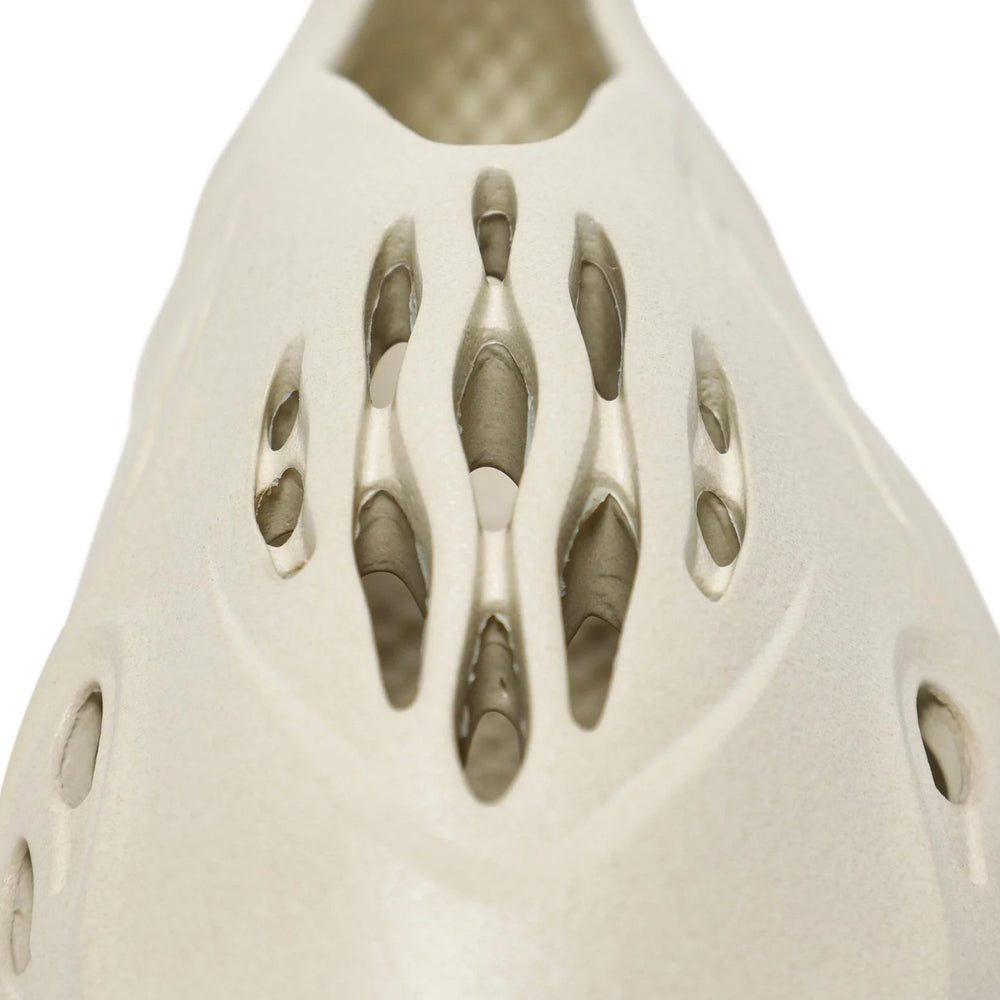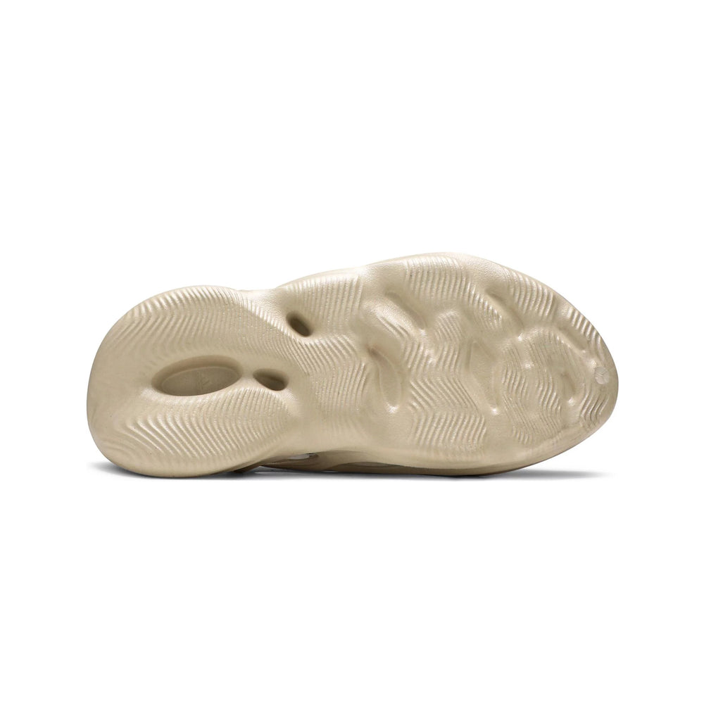 The subtle light tan hue of the adidas Yeezy Foam Runner "Sand" complements its molded one-piece construction. The upper, which is made of EVA foam, has sculpted lines and numerous mapping vents located across the midfoot and vamp for improved ventilation. The curved outsole has a wavy traction pattern, and the textured footbed keeps the foot firmly in place. Under the heel, there is a stamped adidas logo.