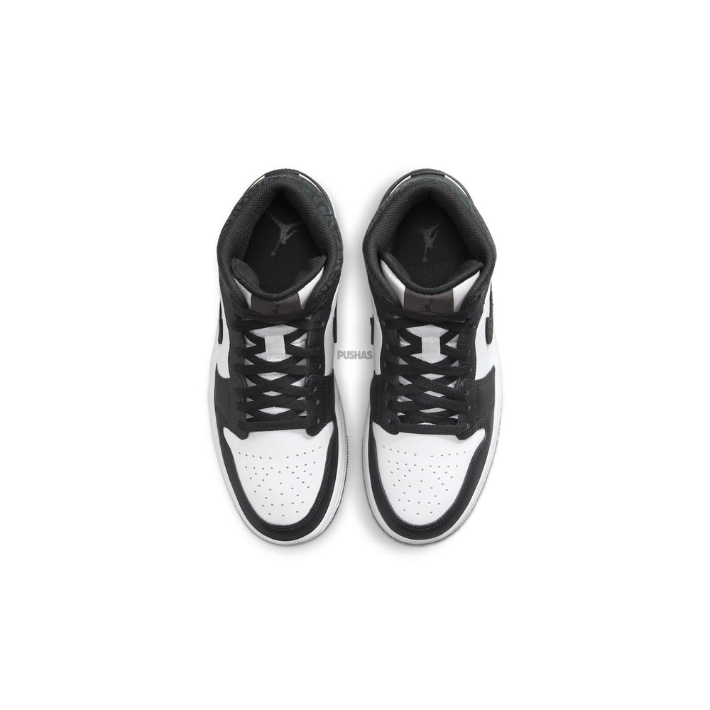 The 'Panda Elephant' colorway features a unique blend of black and white, creating a striking contrast reminiscent of the black and white fur pattern of a panda. The leather upper is adorned with elephant print overlays, adding a textured and distinctive touch that sets these Jordans apart. The mid-top silhouette offers ankle support and a fashion-forward look that easily transitions from the courts to the streets.