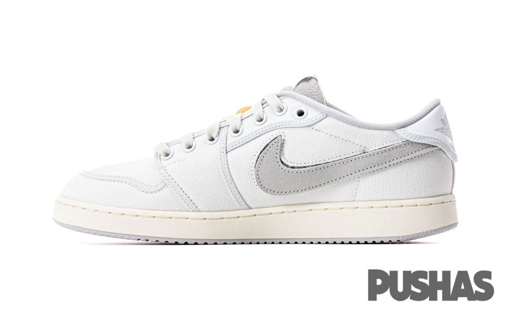 The white and neutral grey canvas upper, sail midsoles, and yellow stitching details are all part of the Union x Jordan partnership. The Union LA logo is positioned below the detachable blue and grey swoosh patches on the Jordan x Union AJKO Low SP.