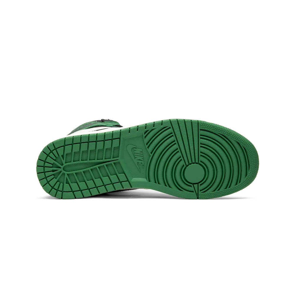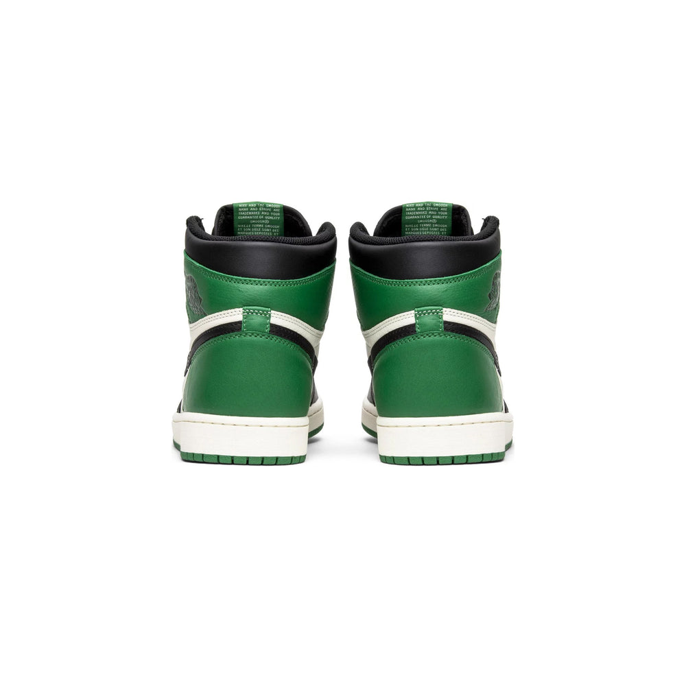 The Air Jordan 1 Retro High 'Pine Green' (2018) is constructed with a premium black tumbled leather base, enhanced by vibrant Pine Green leather overlays, creating a striking contrast. The shoe features the iconic Swoosh in black, blending seamlessly into the design, while the white midsole adds a clean, crisp break between the dark and green elements. The Wings logo on the collar is embossed in black, staying true to the traditional Jordan 1 design, while a green rubber outsole provides both style and traction. The use of high-quality materials ensures both durability and comfort, making it a reliable choice for daily wear or special occasions.