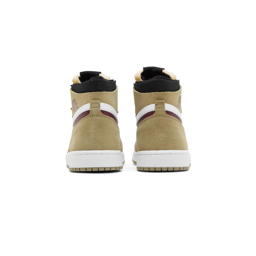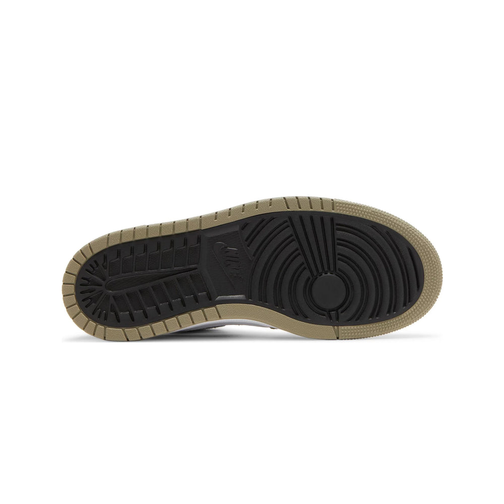 The Air Jordan 1 Zoom CMFT 'Neutral Olive' features a clean "Neutral Olive" leather upper, which is complemented by tonal suede overlays for a sophisticated and versatile look. The shoe’s design is anchored by its minimalist color palette, providing a sleek and adaptable aesthetic that can seamlessly integrate into various wardrobes. Notably, the Zoom Air cushioning technology is incorporated within the midsole, offering superior comfort and support without compromising on the classic Jordan feel. The silhouette is completed with a contrasting white midsole and a translucent outsole, enhancing its visual appeal and ensuring durability. The sneaker’s design is further accentuated by subtle branding details, including a reflective Swoosh and a debossed Wings logo on the heel, maintaining the classic Air Jordan identity while embracing contemporary updates.
