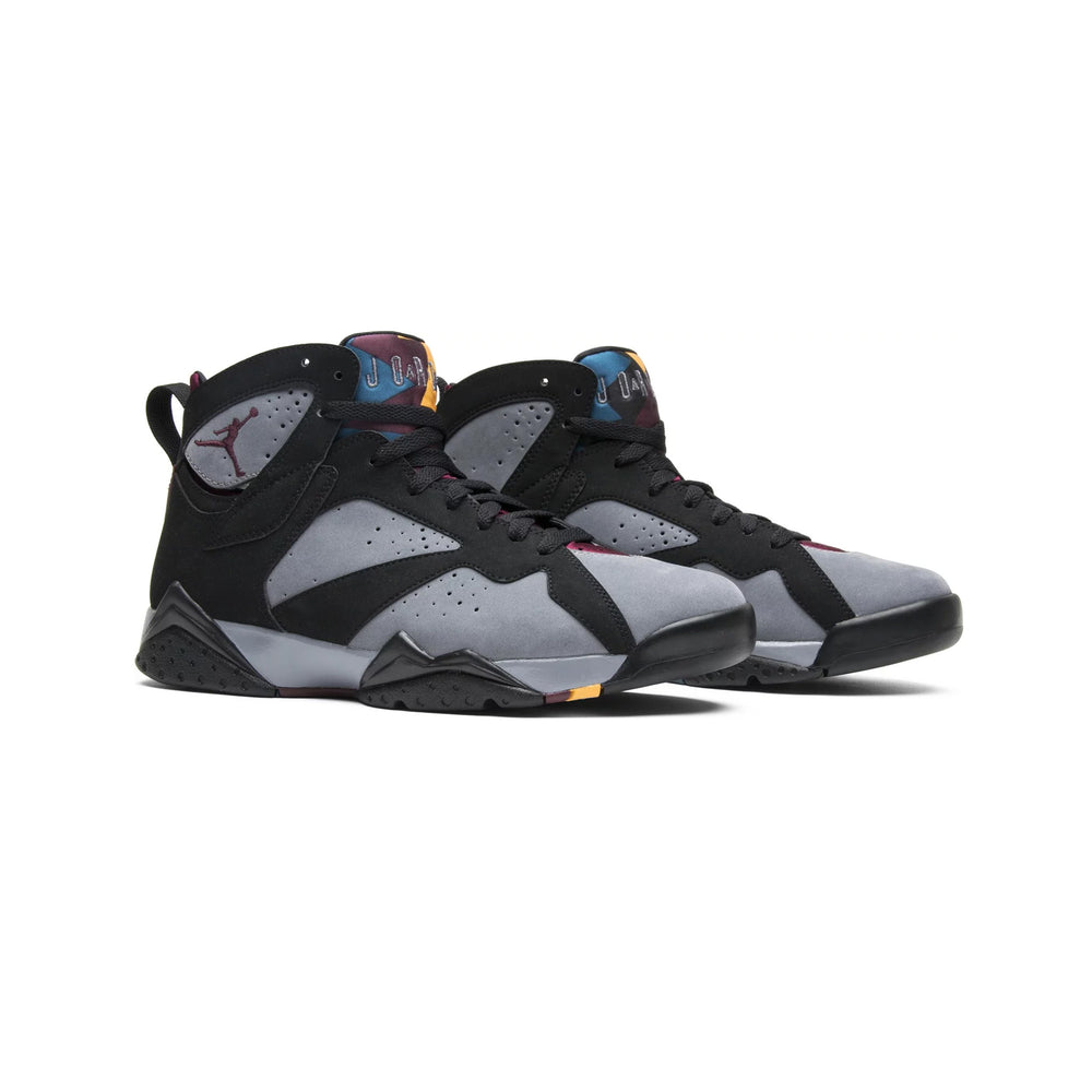 The Air Jordan 7 Retro 'Bordeaux' stands out with its distinctive color blocking and premium materials. The upper combines a mix of nubuck and leather in a black and light graphite palette, accented by the signature 'Bordeaux' hue on the midsole, tongue, and heel tab. The unique, geometric pattern on the tongue—featuring shades of yellow, green, and blue—adds a vibrant touch, reminiscent of the early '90s aesthetic.