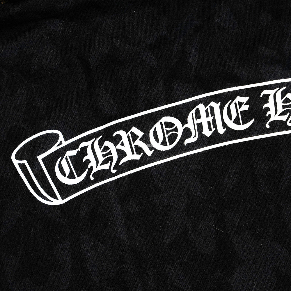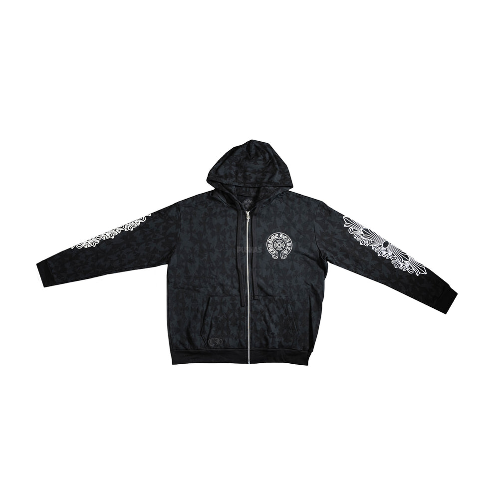 The Chrome Hearts Cemetery Cross Print Zip Up Hoodie 'Black' features a high-quality cotton construction that ensures both comfort and durability. The hoodie is adorned with the brand’s signature Cemetery Cross print, a design that has become synonymous with Chrome Hearts’ gothic style. The black base color provides a versatile canvas, making it easy to pair with a variety of outfits. The hoodie includes a full zip closure, ribbed cuffs and hem, and a drawstring hood, offering functionality and a snug fit. The Chrome Hearts logo is prominently displayed on the chest, adding a touch of exclusivity and brand recognition.