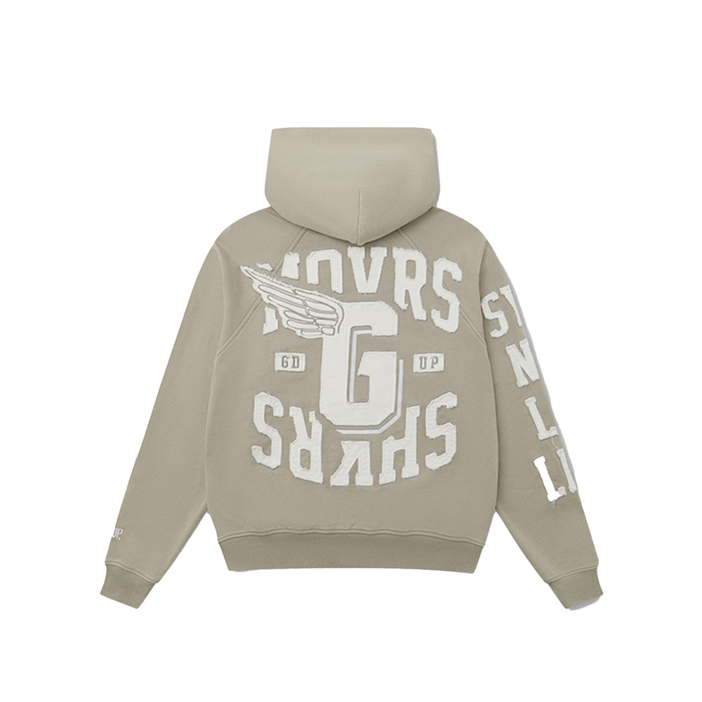 Delivery 09/24 Fabric - 380GSM Brushed Fleece Movers & Shakers distressed EMB appliqué on chest & back SYD NY LA LDN distressed EMB on sleeve Double zip Kangaroo pocket *Relaxed fit - true to size