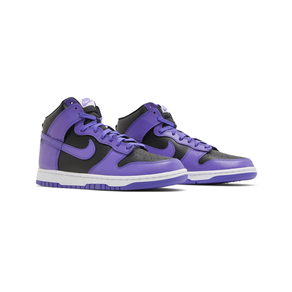 The Nike Dunk High 'Psychic Purple' is meticulously crafted with a robust leather base, exuding durability and premium quality. The upper is drenched in a mesmerizing shade of "Psychic Purple," offering a visually captivating aesthetic. This bold hue is contrasted by crisp white accents on the Swoosh, laces, and midsole, creating a harmonious balance that highlights the sneaker's dynamic design. The high-top construction provides ample ankle support, while the padded collar and tongue ensure comfort during extended wear. The perforated toe box enhances breathability, making it an ideal choice for both casual outings and athletic endeavors.