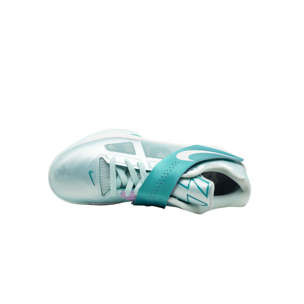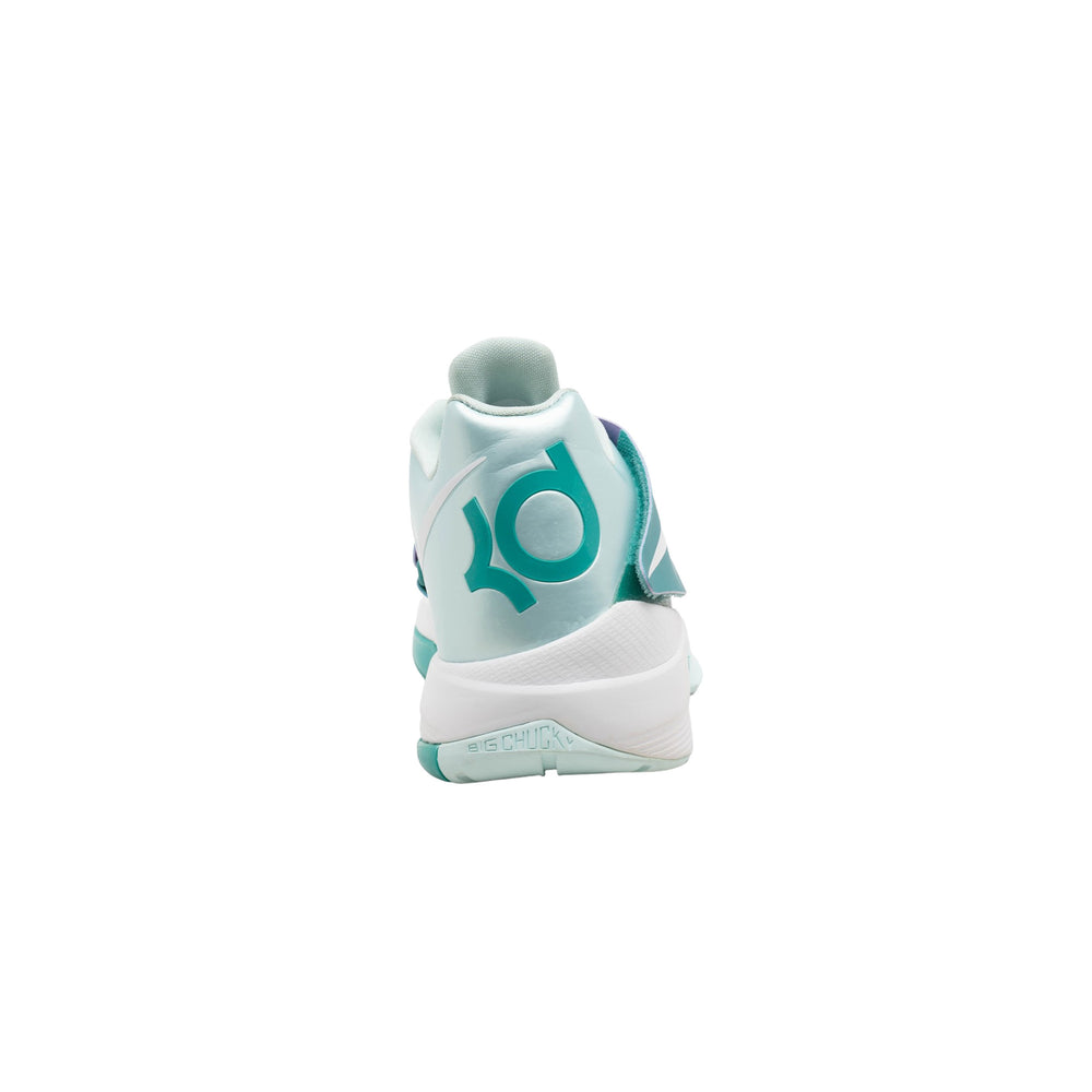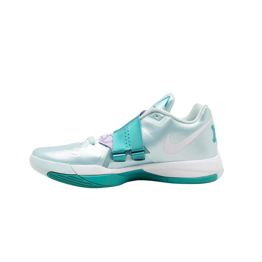 Crafted with meticulous attention to detail, the Nike KD 4 'Easter' boasts a palette reminiscent of a blooming spring garden. The upper features a pristine white base, symbolizing the purity and freshness of the season, while accents of mint green and soft lilac adorn the overlays, invoking images of delicate flowers in full bloom. The iconic Nike Swoosh graces the sides in a subtle yet striking manner, adding a touch of sporty sophistication to the design. Completing the look is Durant's logo prominently displayed on the tongue, a testament to the partnership between the basketball superstar and the renowned sportswear brand.