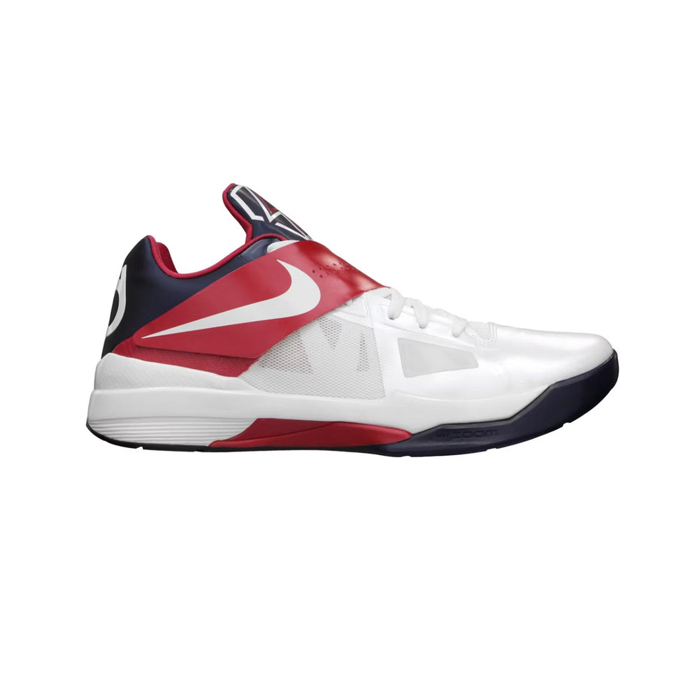 Patriotic Colorway: The KD 4 'USA Olympic' showcases a patriotic blend of white, obsidian, and university red, symbolizing the American flag and celebrating Team USA’s success in the 2012 Olympics.