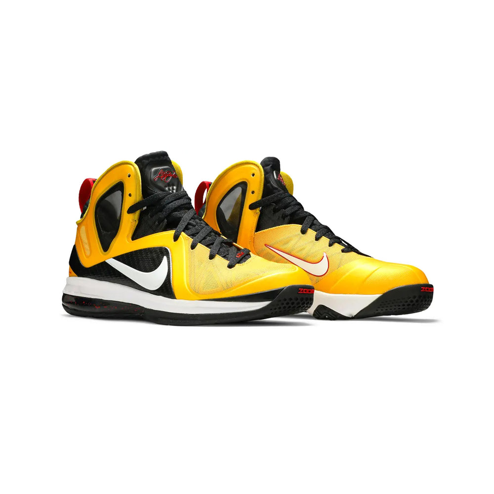 The Nike LeBron 9 PS Elite 'Taxi' (2012) is a standout in the LeBron signature line, showcasing performance-driven design with a bold color palette. Released as part of Nike's Elite Series, this sneaker elevates on-court functionality while embracing an unmistakably striking aesthetic. Overview The 'Taxi' edition features a vibrant yellow and black upper, reminiscent of New York City taxis, and is constructed with a combination of Hyperfuse and Flywire technology for lightweight durability and lockdown. Carbon fiber accents along the midfoot and heel enhance stability, while the full-length Zoom Air unit provides responsive cushioning for high-performance play. Metallic gold Swooshes and detailing on the tongue add a touch of luxury, while the black laces and midsole balance the energetic yellow tones. Designed for elite athletes, this model underscores Nike's commitment to blending style and superior performance, making it a must-have for collectors and basketball enthusiasts alike. Key Highlights • Dynamic 'Taxi' Colorway: A striking yellow-and-black design inspired by urban taxis, accented with metallic gold for a premium look. • High-Performance Technology: Hyperfuse and Flywire construction offer lightweight support, while carbon fiber plates provide exceptional stability during gameplay. • Elite Comfort and Cushioning: Equipped with a full-length Zoom Air unit for responsive cushioning, ensuring peak performance on the court.