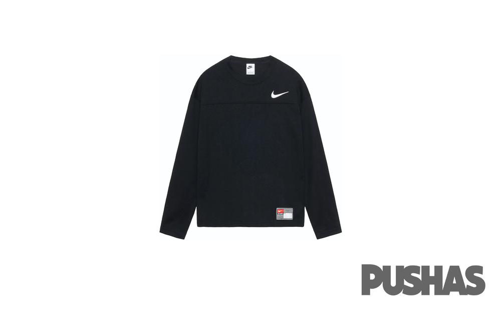 The collaboration's distinctive branding is tastefully incorporated, featuring the iconic Stussy logo alongside the renowned Nike Swoosh for a bold yet refined look. The jersey's loose fit and dropped hem contribute to its modern silhouette, allowing for unrestricted movement and a fashion-forward aesthetic.