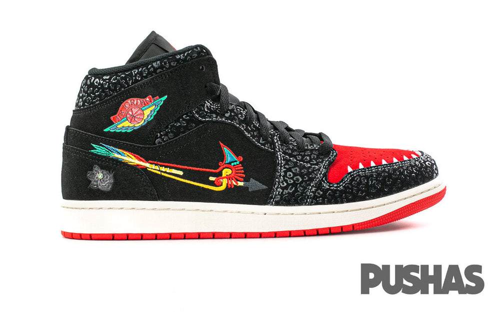 Drawing inspiration from Mexico's Día de los Muertos, also known as Day of the Dead, the Jordan 1 Mid Siempre Familia features a black and red suede upper with spirit related graphic embroidery prominent on the Swooshes and heel wraps. From there, glazed embossed cheetah print patterns cover the overlays. At the base, a Sail and red sole completes the design.