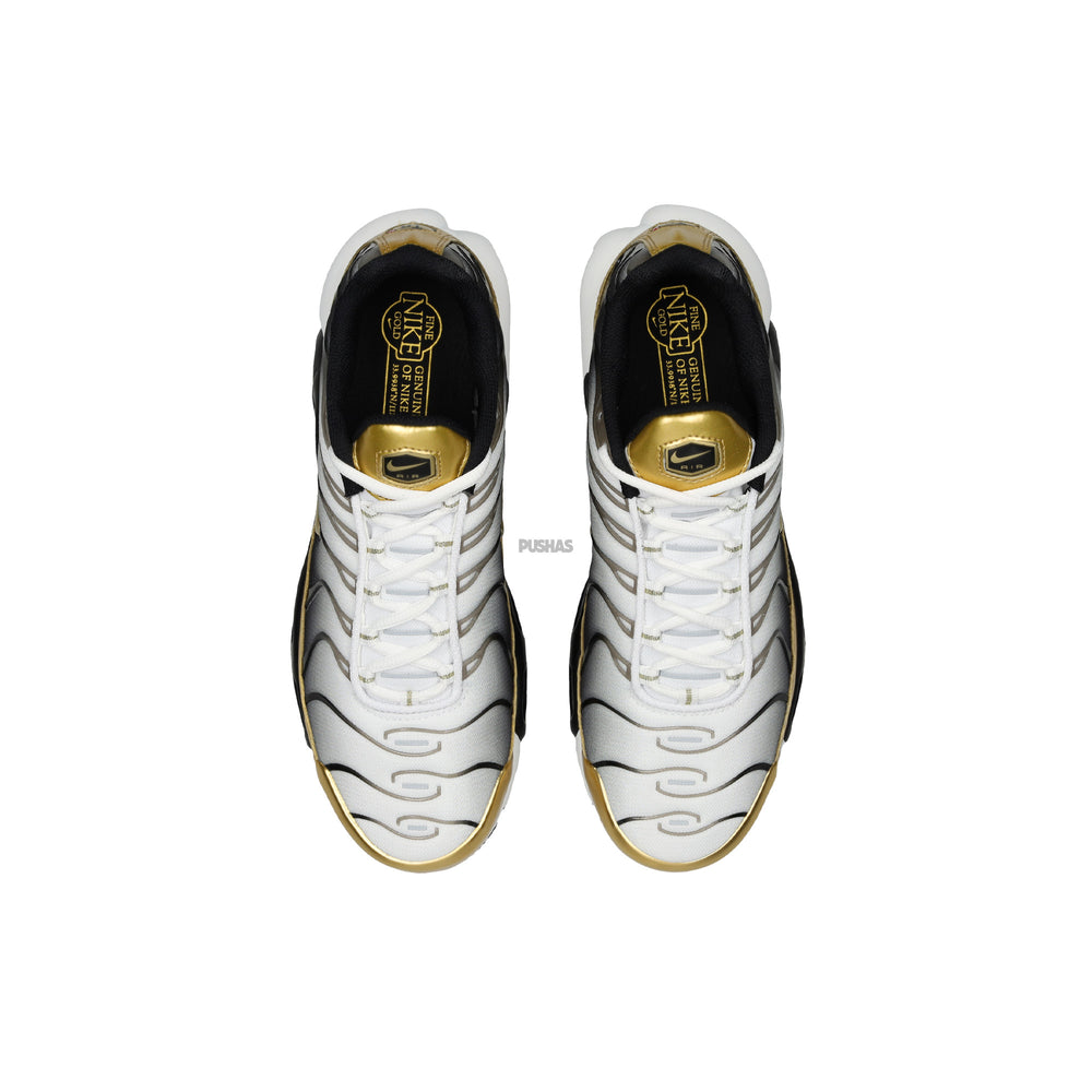 The Air Max Plus Premium '50th Anniversary' features a striking "Metallic Silver" base that reflects the celebratory spirit of this landmark occasion. The sneaker's signature gradient overlays transition from "Black" to "Bright Crimson," evoking a sense of dynamic movement and energy. The classic TPU stripes are reimagined in a sleek, reflective finish, enhancing both durability and style. Gold accents are strategically placed on the tongue, laces, and Air Max bubble for a touch of opulence, while the heel counter boasts a commemorative 50th-anniversary emblem. The design is completed with a semi-translucent outsole that echoes the sneaker's modern luxury ethos, ensuring a blend of aesthetic appeal and performance.