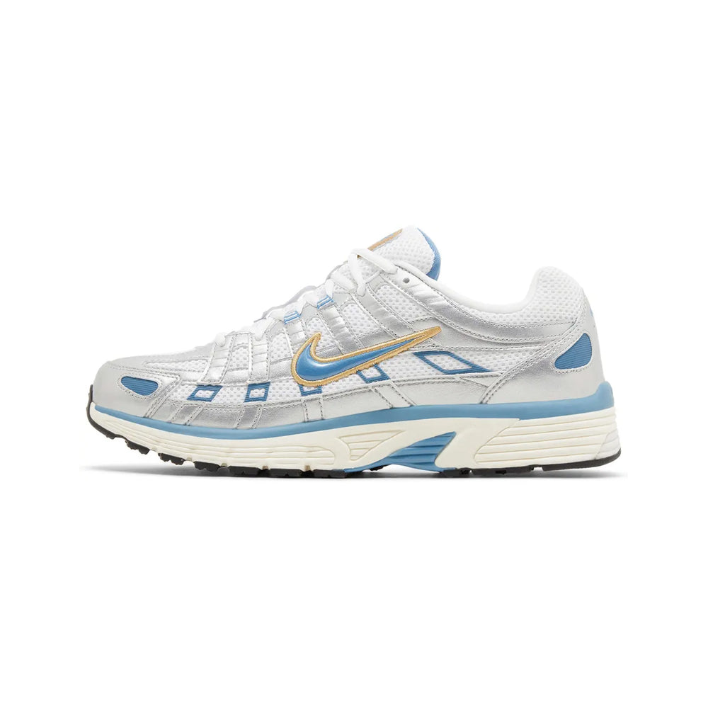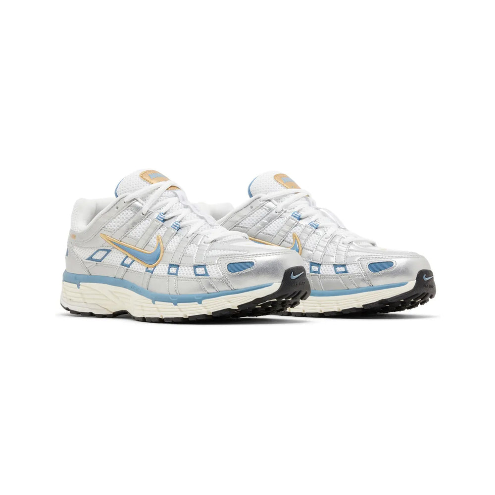 The Nike P-6000 'Metallic Silver Aegean Storm' (2024) continues the legacy of Nike's retro-futuristic running-inspired design, blending sleek metallic accents with a modern color palette. This release showcases Nike's commitment to merging vintage aesthetics with contemporary styling, offering a versatile and dynamic sneaker for casual wear and urban exploration. Overview The Nike P-6000 'Metallic Silver Aegean Storm' features a breathable mesh upper layered with metallic silver overlays that exude a futuristic edge. Striking "Aegean Storm" blue accents highlight the Swoosh, tongue, and heel, providing a bold contrast to the metallic sheen. A lightweight foam midsole delivers responsive cushioning, while a durable rubber outsole ensures traction across various surfaces. With design cues drawn from early 2000s running sneakers, this model captures the nostalgia of the era while meeting the needs of today's streetwear enthusiasts. Key Highlights • Striking Metallic Silver Upper: Sleek overlays paired with breathable mesh ensure durability, comfort, and a standout appearance. • Aegean Storm Blue Accents: Bold blue highlights on the Swoosh, tongue, and heel add a vibrant touch to the futuristic aesthetic. • Retro-Futuristic Design: Combines the early 2000s running inspiration with modern functionality, making it a versatile option for streetwear or casual outfits.