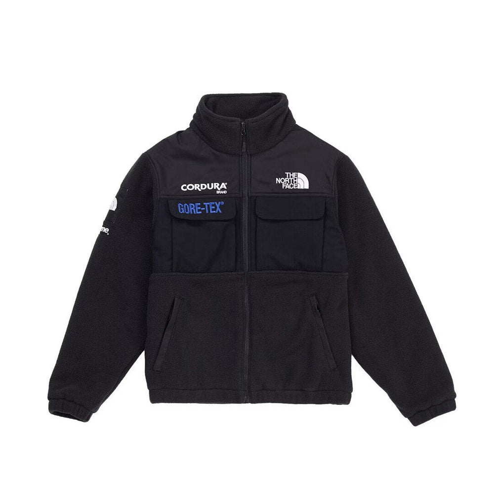 The jacket is crafted from a high-performance fleece material, ensuring insulation against cold weather. The deep black colorway is accented by bold, oversized branding, with Supreme and The North Face logos prominently displayed on the chest and sleeve, further enhancing its visual appeal. The design is rooted in practicality, featuring zippered hand pockets for secure storage and a full-zip front for easy layering. Reinforced panels on the shoulders and elbows provide extra durability, making it suitable for both city wear and outdoor adventures. The jacket’s classic expedition silhouette is complemented by adjustable cuffs and a drawstring hem, allowing for a customized fit.