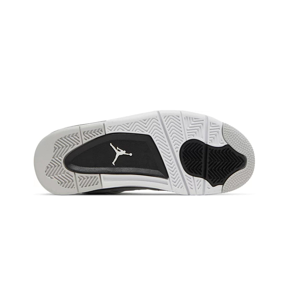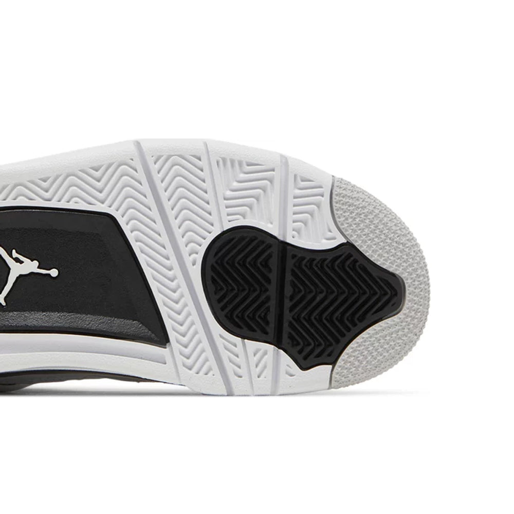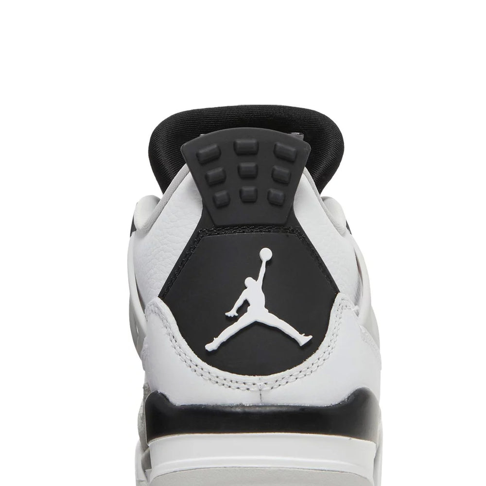 The Air Jordan 4 Retro 'Military Black' GS showcases a crisp white leather upper with smooth, durable nubuck accents along the mudguard in grey. The sneaker's black detailing across the eyelets, heel tab, and signature side netting contrasts sharply with the white base, creating a minimalist yet impactful look. A visible Air unit in the heel ensures cushioned comfort, while the forefoot features traditional lace locks for a snug, customizable fit. The neutral color palette enhances its versatility, making it an easy choice for any casual or athletic outfit. Built to last, this model fuses heritage design with modern functionality, making it a must-have for young sneaker enthusiasts.