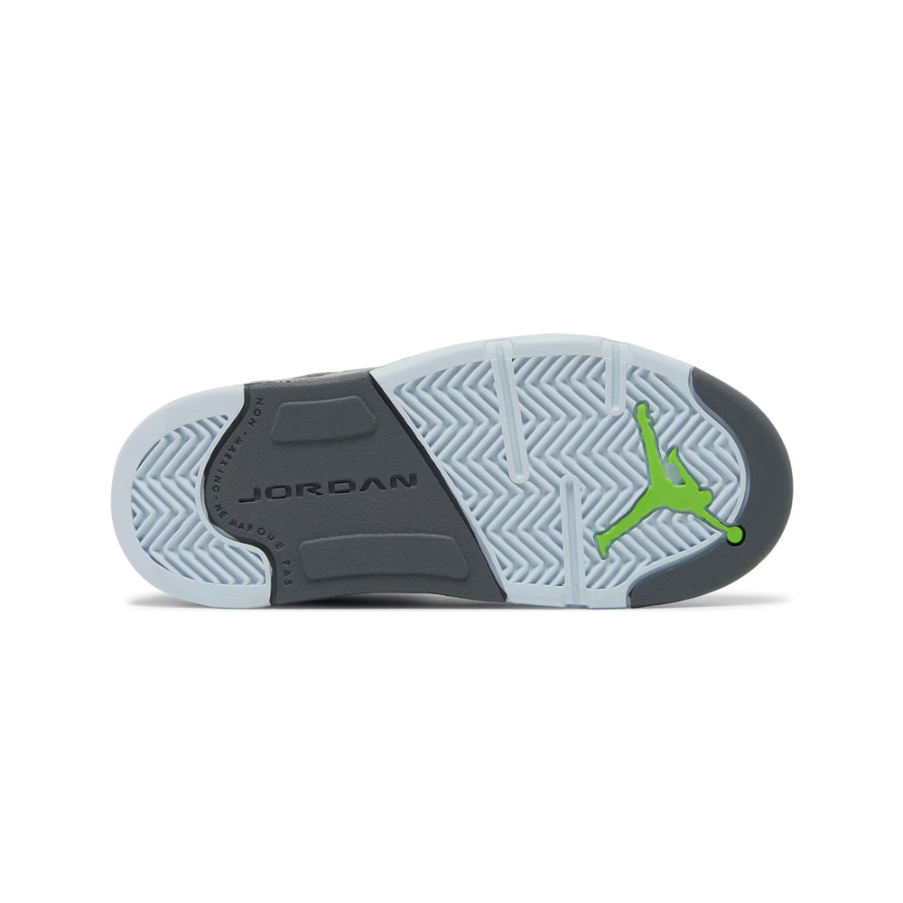 The Air Jordan 5 Retro 'Green Bean' TD showcases a sleek grey upper crafted from premium suede, giving the sneaker a refined and luxurious feel. The standout feature of this design is the striking 'Green Bean' accents, found on the midsole, tongue, and lace locks, offering a fresh contrast to the muted base. The iconic reflective tongue adds a touch of flair, enhancing visibility while staying true to the sneaker's original DNA. The translucent outsole complements the overall aesthetic, providing a modern twist while maintaining the retro appeal. This model is designed with the active toddler in mind, ensuring comfort and durability for young feet, making it perfect for both casual outings and playtime.