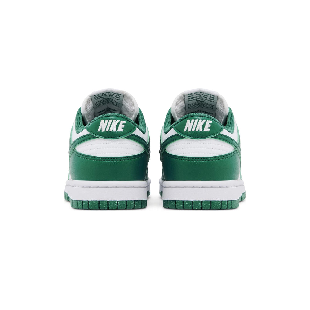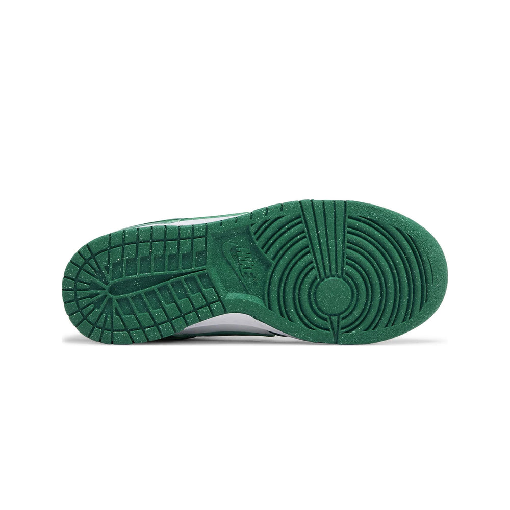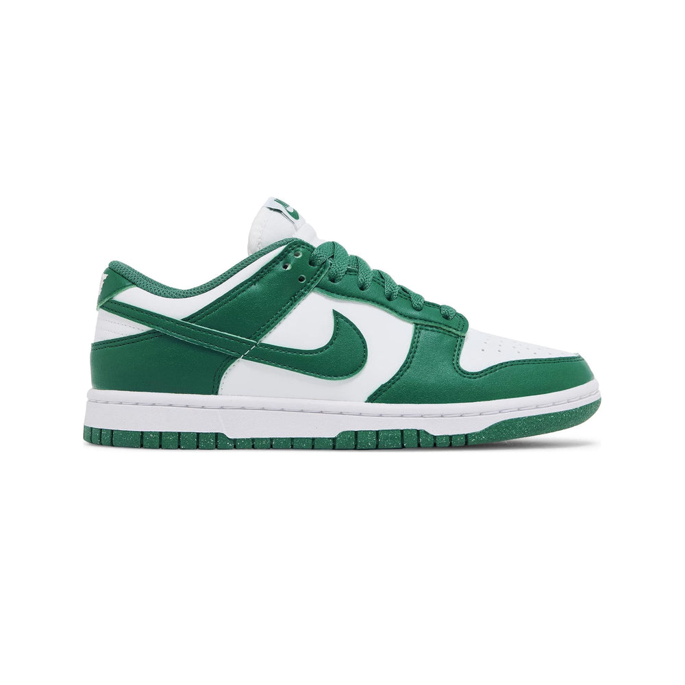 Crafted with a focus on sustainability, the Nike Dunk Low Next Nature 'Bicoastal' features a synthetic leather upper made from recycled materials, showcasing a sophisticated "Bicoastal" green hue. The overlays in a matching green tone provide a monochromatic aesthetic that is both modern and versatile. Complementing the green palette are crisp white accents on the Swoosh, laces, and midsole, offering a fresh contrast that enhances the overall design. The sneaker's eco-friendly credentials are further emphasized by the speckled rubber outsole, made from Nike Grind, which utilizes recycled manufacturing waste. This model not only exemplifies Nike's innovative approach to sustainability but also maintains the beloved Dunk silhouette's classic lines and comfort.