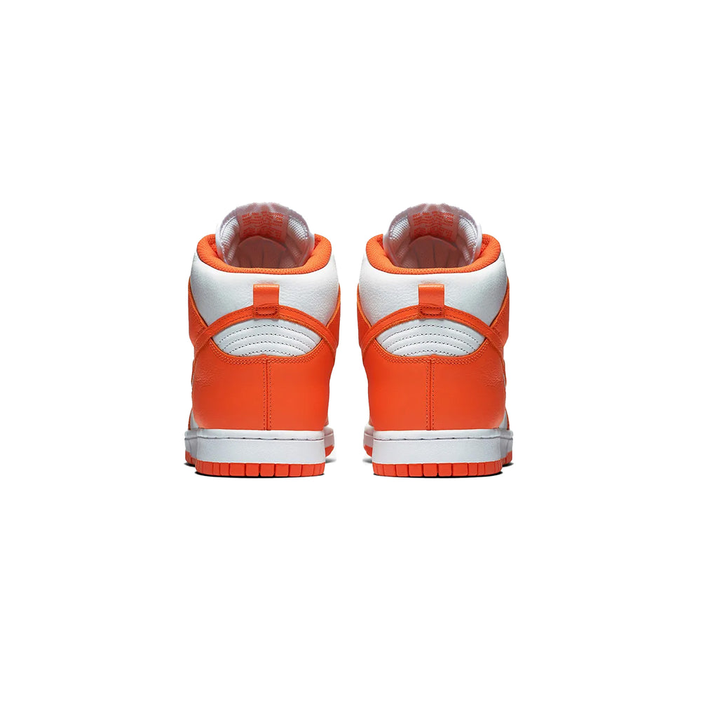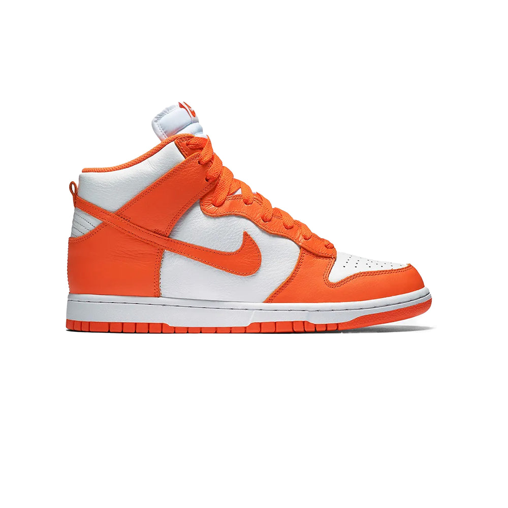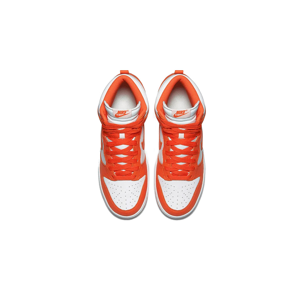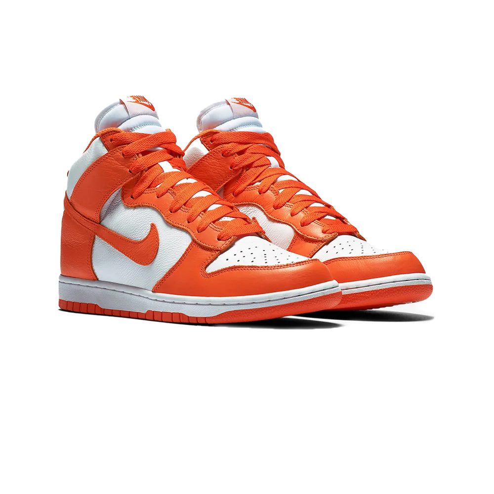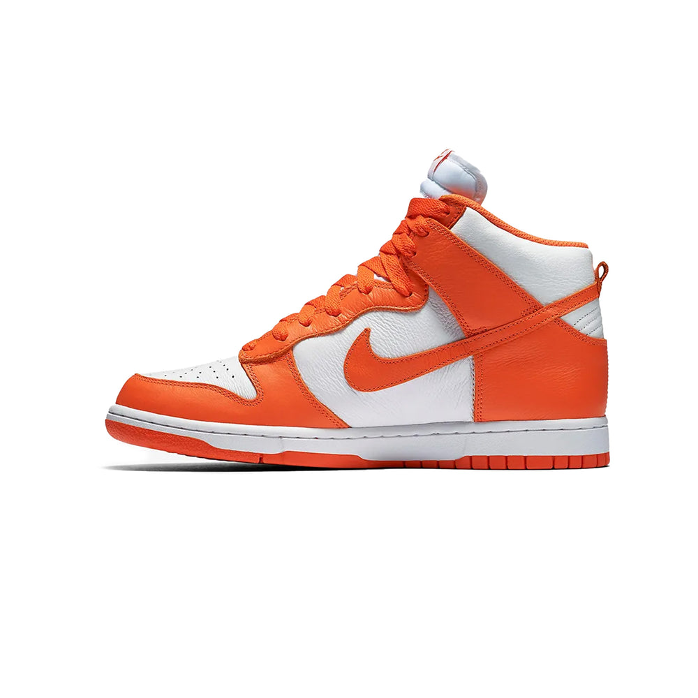 The Nike Dunk High 'Syracuse' (2016) features a vivid "Orange Blaze" leather upper that captures the essence of Syracuse University's basketball legacy. White leather overlays accentuate the design, providing a clean and timeless aesthetic. The iconic Nike Swoosh adorns the sides in white, contrasting boldly against the vibrant orange backdrop. A cushioned midsole offers comfort and support, ideal for both on-court performance and off-court style. Whether worn on the streets or in the stands, this Dunk High pays tribute to Syracuse's rich sports heritage with every detail meticulously crafted for enthusiasts and collectors alike.