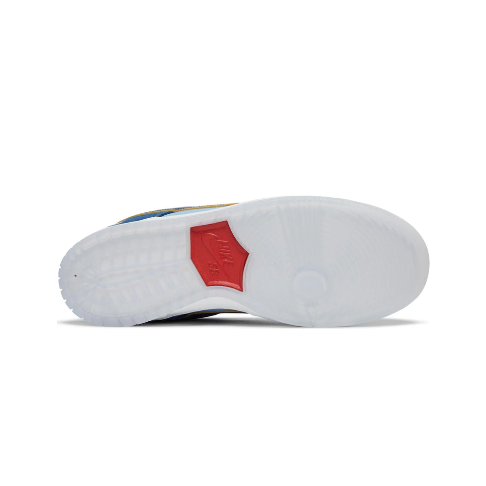 Crafted with a meticulous attention to detail, the Nike SB Dunk Low Pro 'Why So Sad?' features a harmonious mix of materials and colors that set it apart. The upper boasts a combination of premium leather and suede, providing durability and a textured aesthetic. The base showcases a deep navy hue, complemented by light blue overlays that add a dynamic contrast. The signature Nike Swoosh, rendered in a gradient of blue to yellow, symbolizes the journey from sadness to joy, a core theme of the design. The heel is adorned with a subtle question mark emblem, further emphasizing the sneaker's introspective motif.