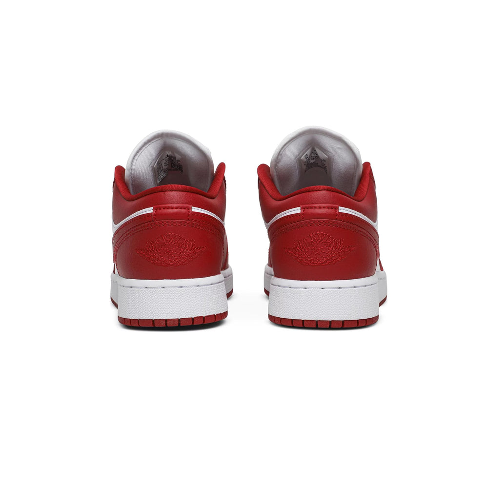 Crafted with a smooth white leather base, the Air Jordan 1 Low 'Gym Red White' GS stands out with striking 'Gym Red' overlays that wrap around the sneaker from the toe box to the heel. The Swoosh, also in 'Gym Red', runs seamlessly along the sides, complementing the overall design. The laces, tongue tag, and lining maintain a clean white, which contrasts beautifully with the red accents, creating a harmonious and eye-catching aesthetic. The midsole is also in white, providing a balanced foundation, while the red outsole ensures durability and traction. This combination of colors not only highlights the timeless design but also infuses it with a vibrant energy that appeals to both young sneakerheads and seasoned collectors.