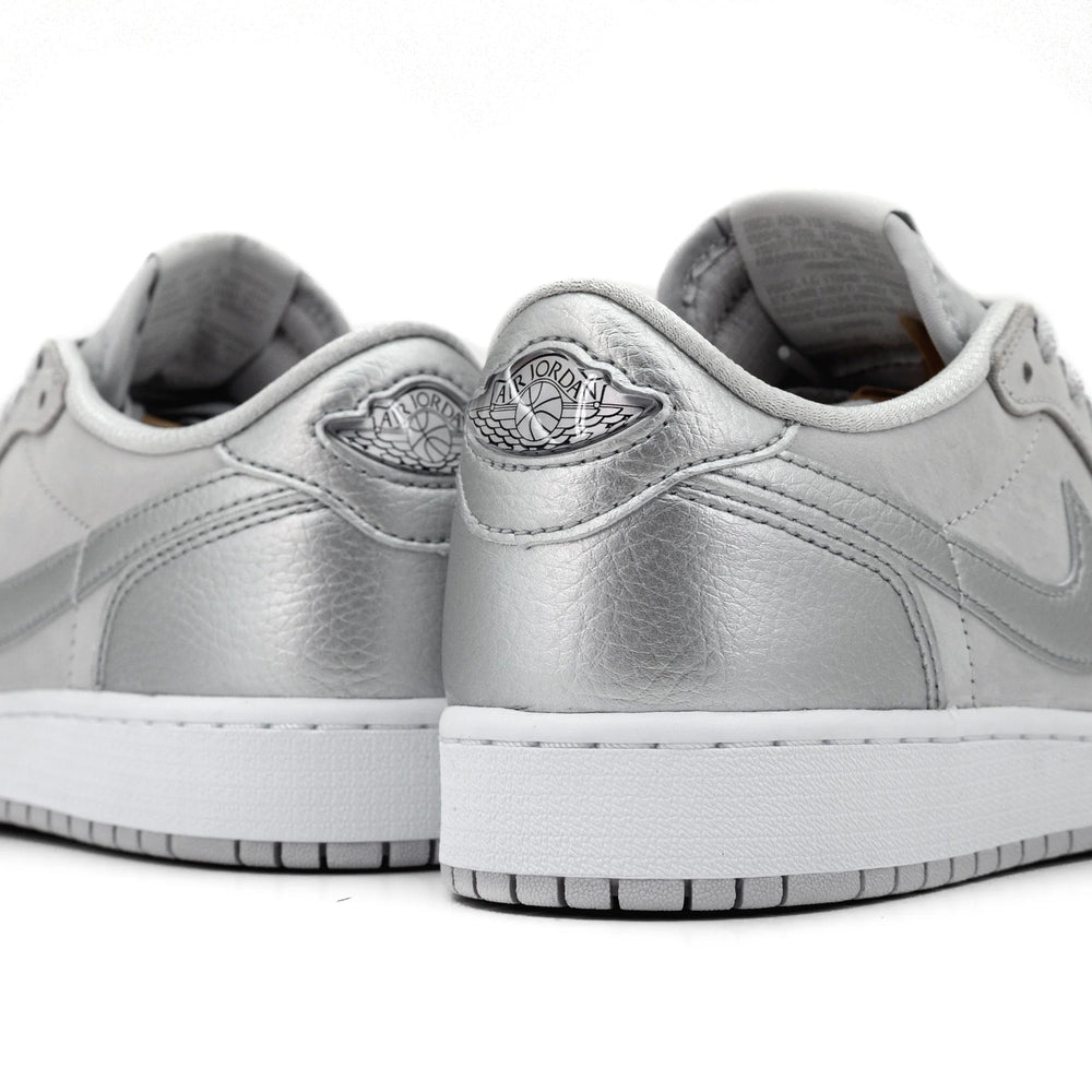 The Air Jordan 1 Low OG 'Metallic Silver' GS showcases a premium white leather base, complemented by striking metallic silver overlays that wrap around the toe, eyelets, and heel, delivering a futuristic yet elegant look. The signature Nike Swoosh, also rendered in metallic silver, adds a cohesive touch to the design. A black Wings logo is prominently featured on the heel tab, maintaining the iconic branding synonymous with the Air Jordan lineage. The midsole, in crisp white, provides a clean contrast to the metallic accents, while a classic black outsole ensures durability and traction.